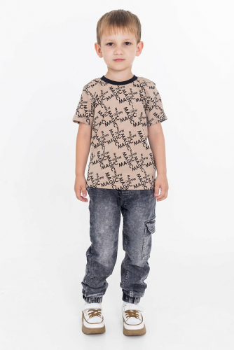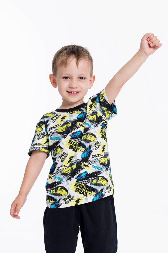 Футболка выполнена из хлопкового полотна c набивным рисунком, с коротким рукавом и круглым вырезом горловины.