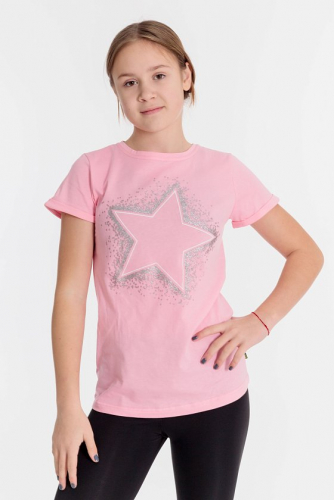 Футболка выполнена из хлопкового полотна c набивным рисунком, с коротким рукавом и круглым вырезом горловины.