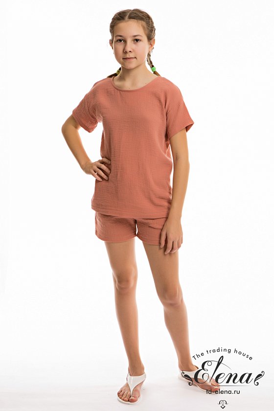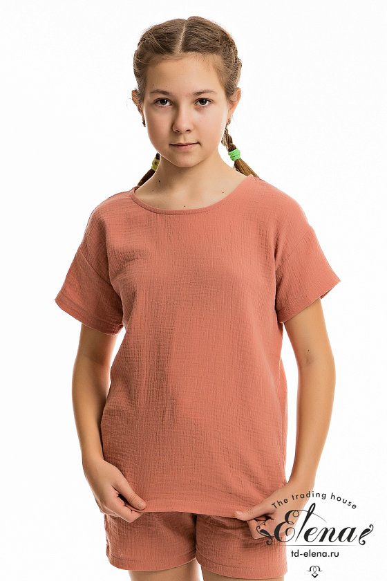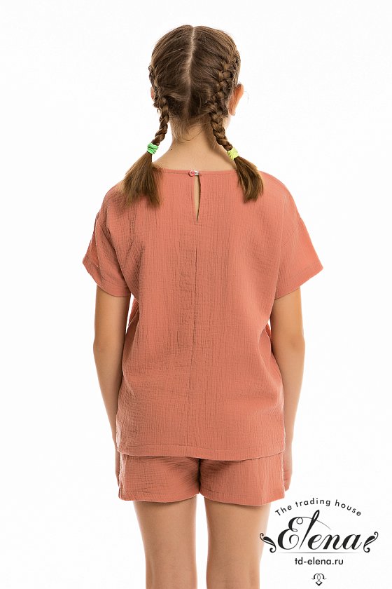 Футболка свободного силуэта из муслина. С коротким рукавом, линия плеча спущена. Вырез горловины обработан бейкой, сзади застёжка на одну пуговицу.