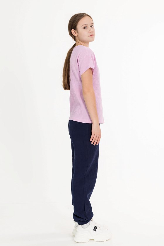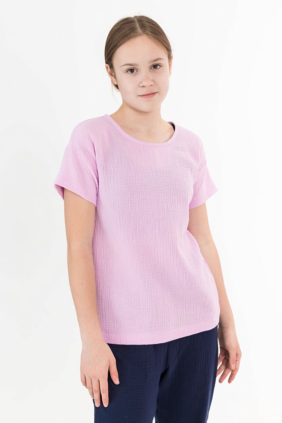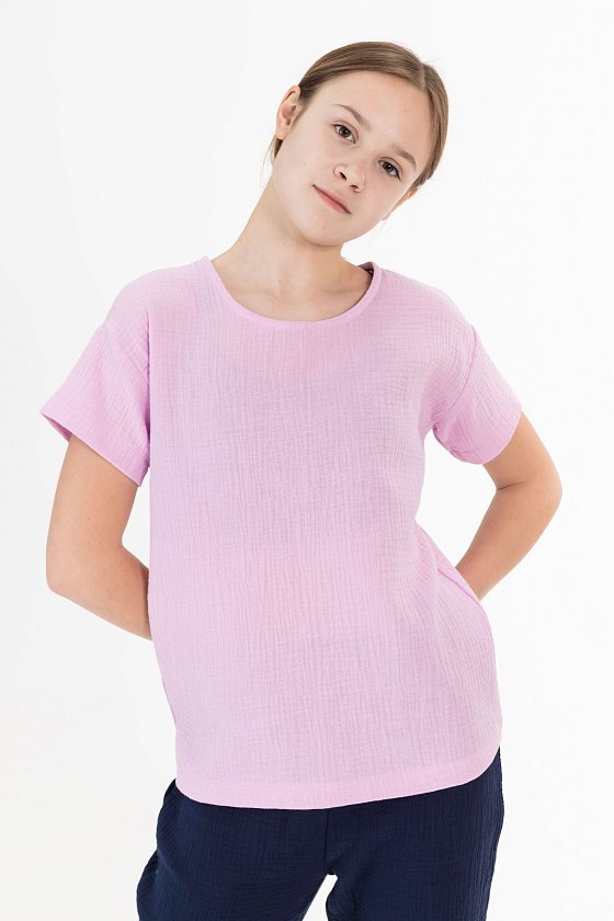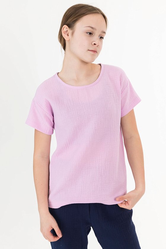 Футболка свободного силуэта из муслина. С коротким рукавом, линия плеча спущена. Вырез горловины обработан бейкой, сзади застёжка на одну пуговицу.