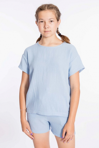 Футболка свободного силуэта из муслина. С коротким рукавом, линия плеча спущена. Вырез горловины обработан бейкой, сзади застёжка на одну пуговицу.