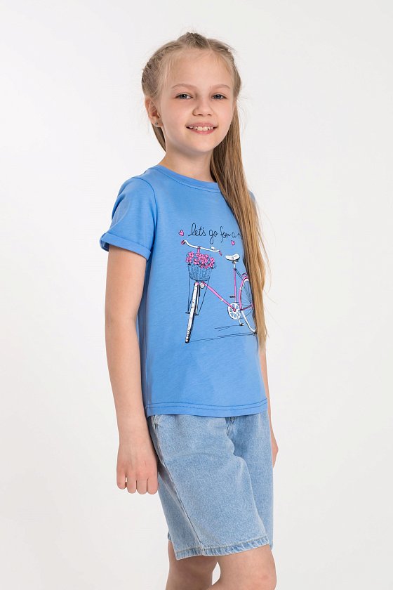 Футболка для девочки выполнена из кулирки, 100% хлопок. С коротким втачным рукавом с отложной манжетой, со скругленным разноуровневым низом и красивым принтом спереди. Горловина округлая, обработана планкой.