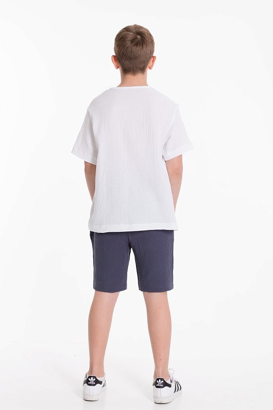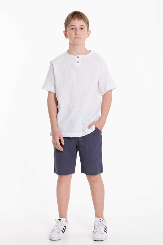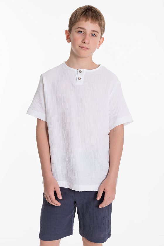 Футболка выполнена из хлопкового полотна - муслина. Силуэт  свободный, круглый вырез горловины украшен двумя пуговицами.