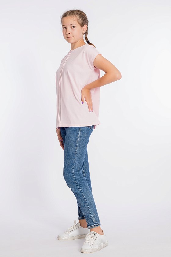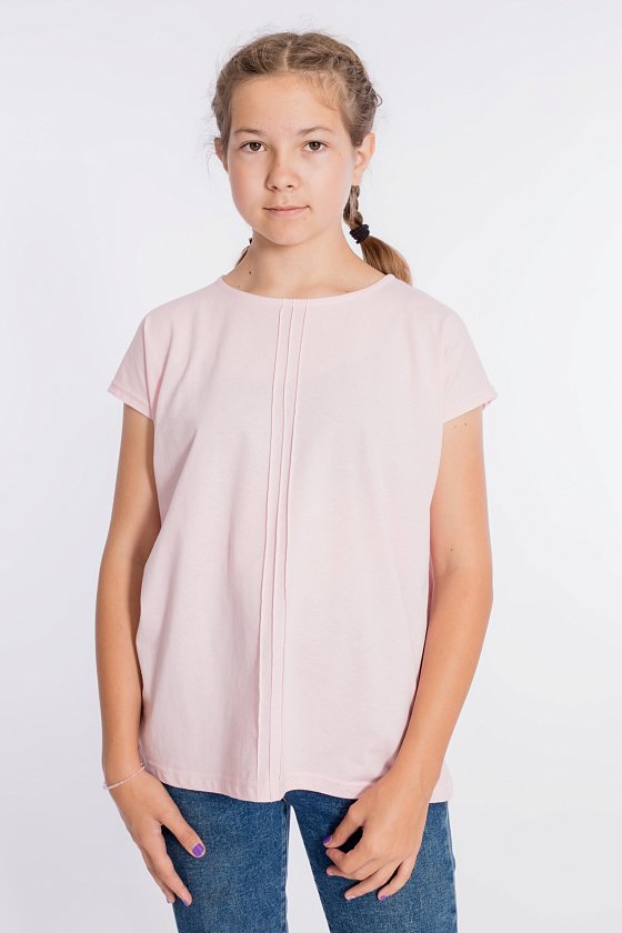 Футболка из однотонной кулирки, со спущенной линией плеча. Горловина с круглым вырезом, спереди по центру футболки три декоративных защипа.