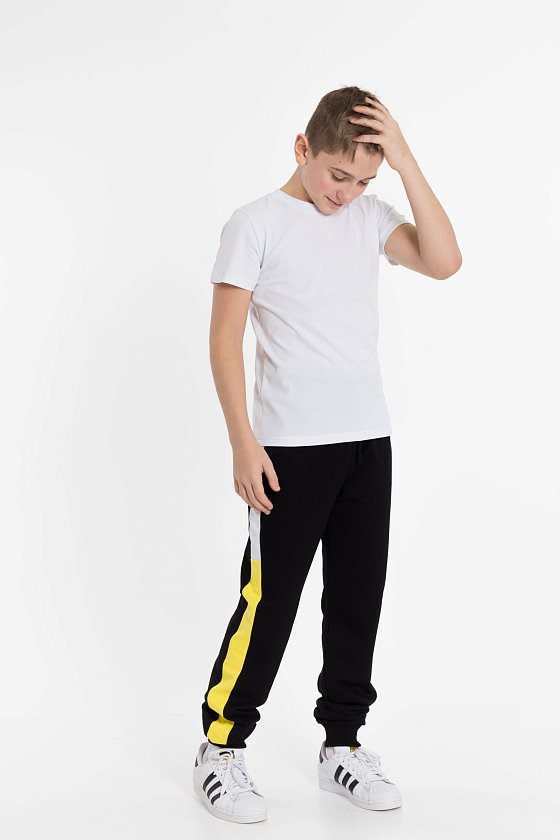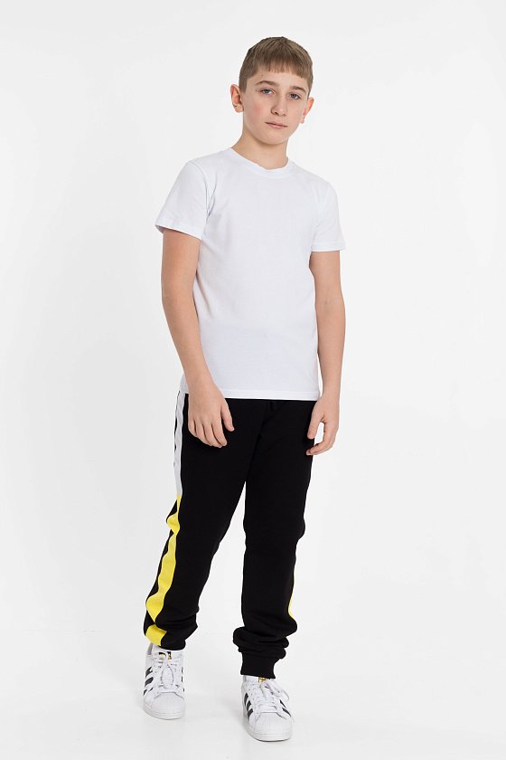 Футболка выполнена из однотонной кулирки с лайкрой. С коротким рукавом и круглым вырезом горловины.
