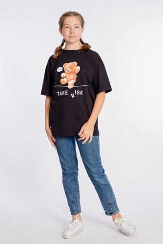 Модная футболка для девочек выполнена из однотонной кулирки. Футболка короткая, свободная, со спущенной линией плеча и рукавом длиной до локтя. Спереди принт.
