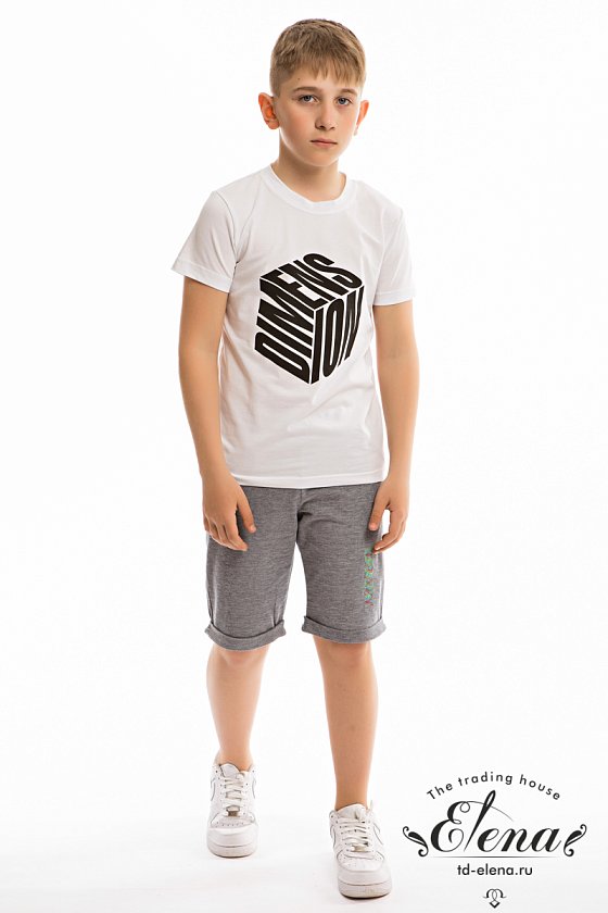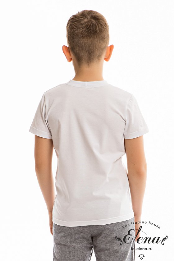 Футболка из х/б полотна с лайкрой, с коротким рукавом и круглым вырезом горловины, оформленным планкой. Спереди нанесён принт.