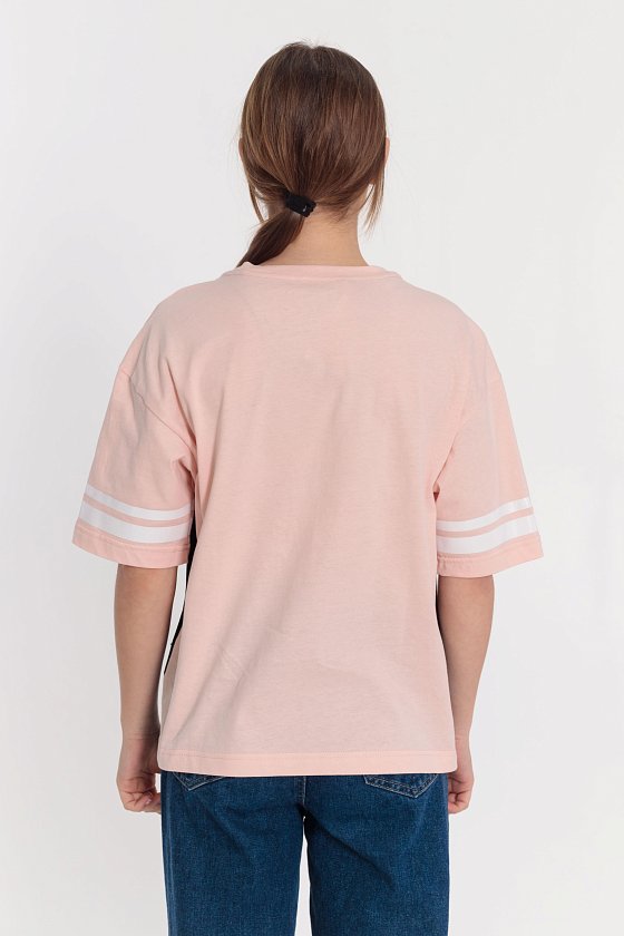 Футболка выполнена из хлопкового полотна, посадка с лёгким эффектом оверсайз. Футболка с коротким рукавом и круглым вырезом горловины, оформленным планкой. Спереди и на рукавах нанесён термопринт.