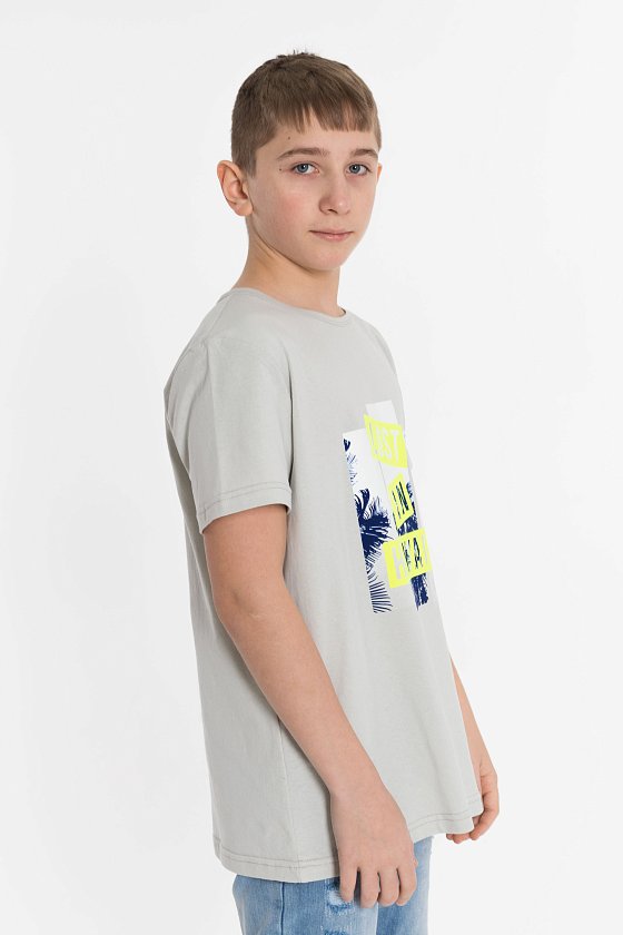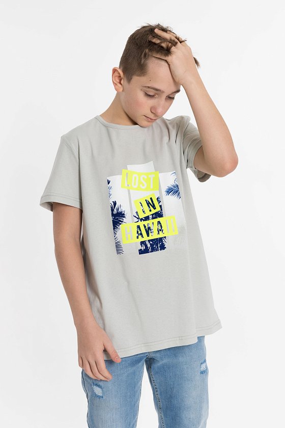 Футболка детская из кулирки, круглый вырез горловины,на полочке принт.