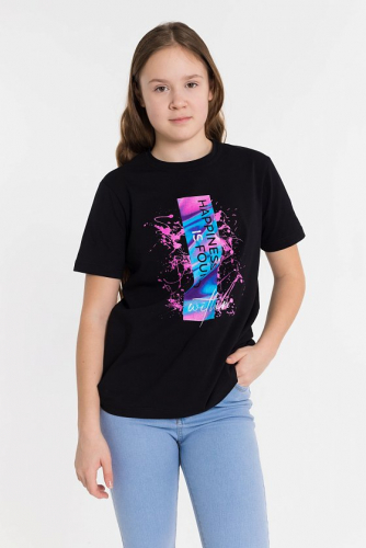 Футболка для девочек из хлопка с добавлением лайкры. Круглый вырез горловины, на полочке принт.