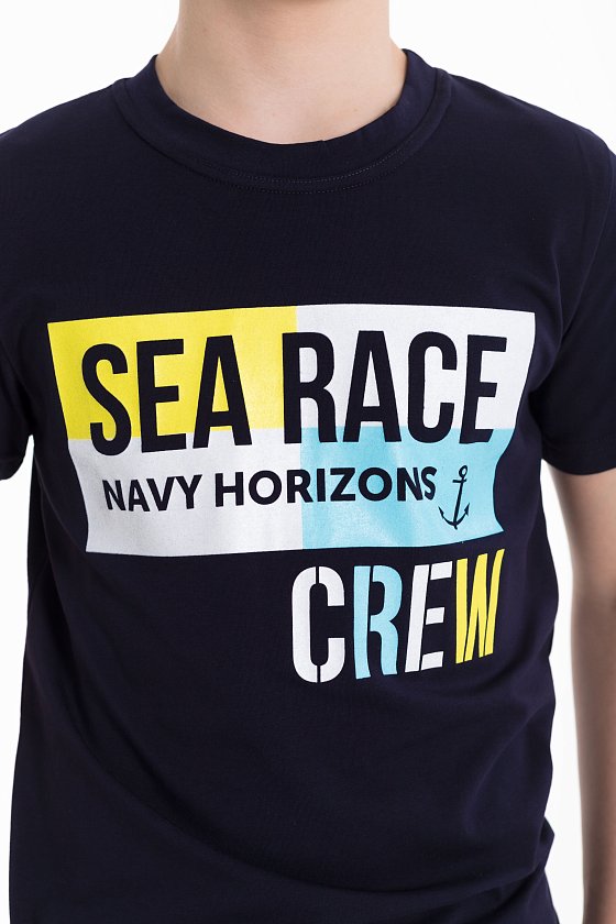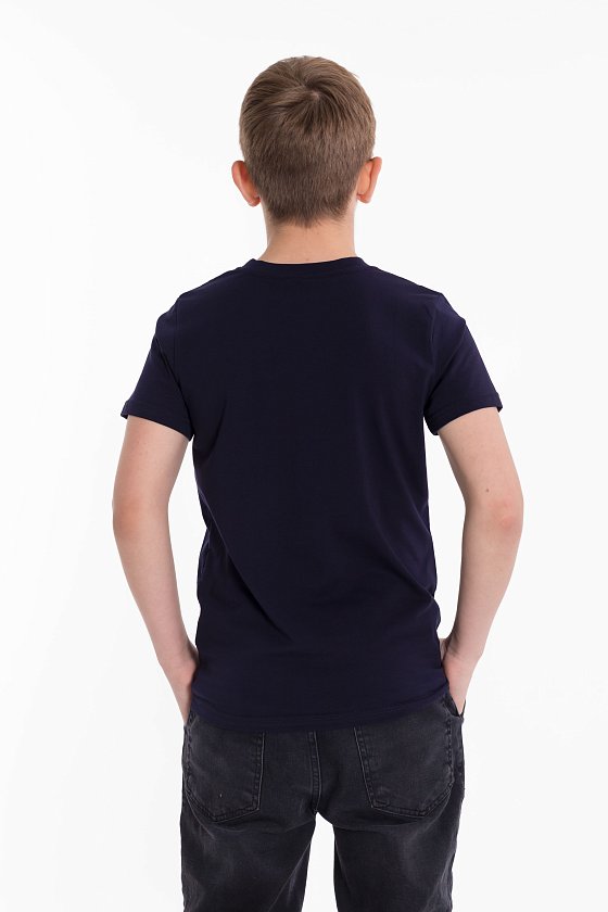 Футболка для мальчиков из хлопка с добавлением лайкры. Круглый вырез горловины, втачной рукав, принт на полочке.