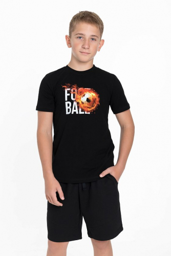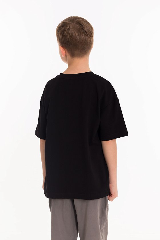 Футболка выполнена из кулирки. Свободный покрой, с коротким спущенным рукавом. Круглая горловина оформлена притачной планкой. Спереди нанесён принт.