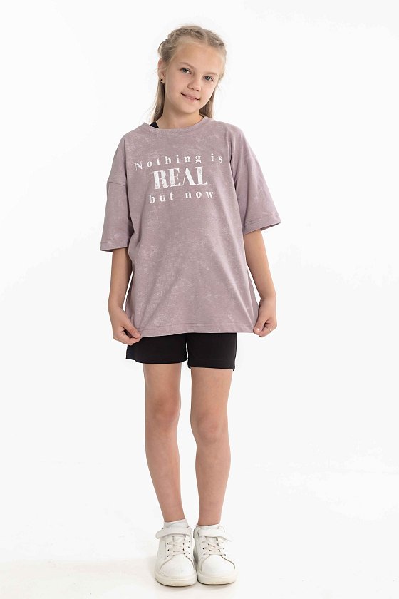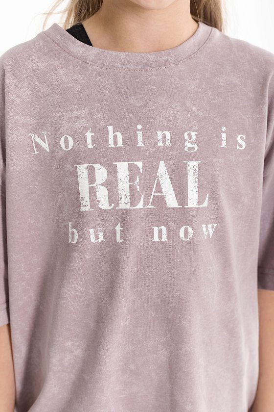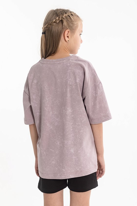 Футболка свободного кроя с круглым вырезом горловины и рукавом до локтя. Футболка выполнена из хлопкового полотна, особенностью модели является спущенная линия плеча и интересный принт спереди.
