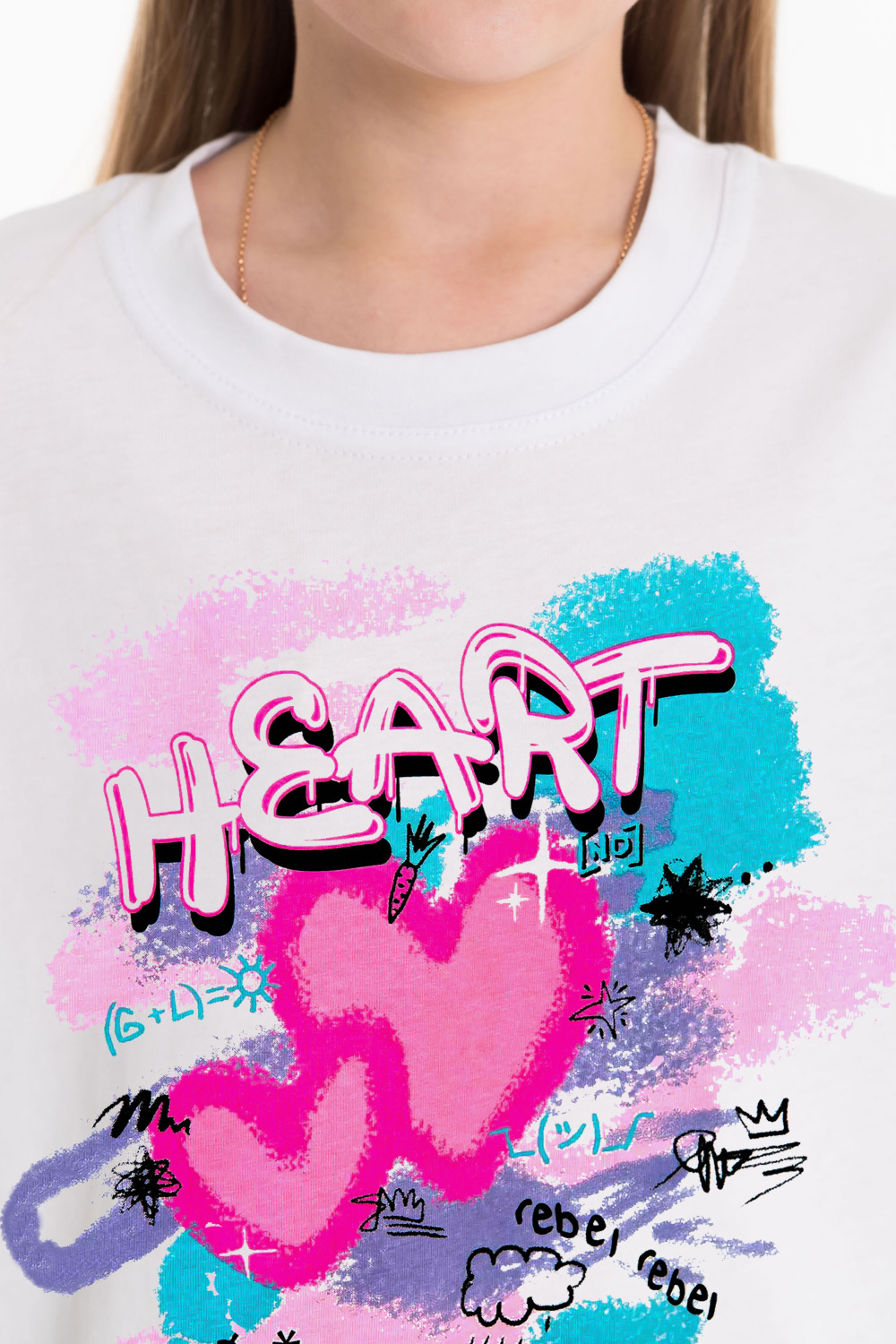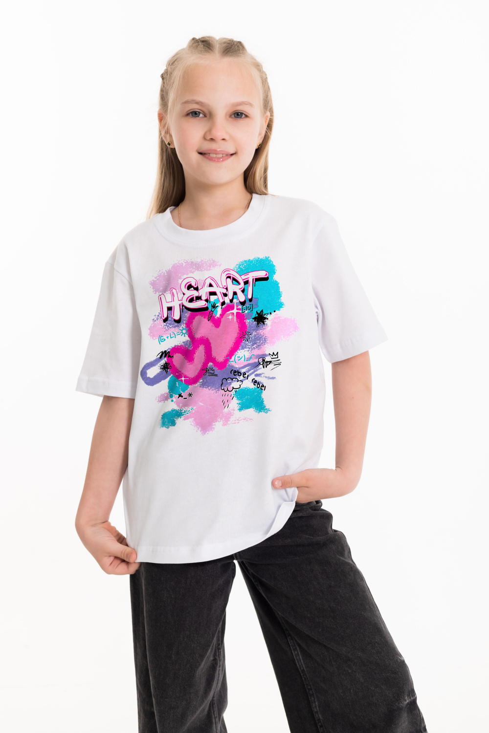 Футболка выполнена из однотонной кулирки, 100% хлопок. С коротким рукавом и круглым вырезом горловины, оформленным планкой. Спереди нанесён принт. Хлопок 100%