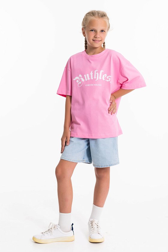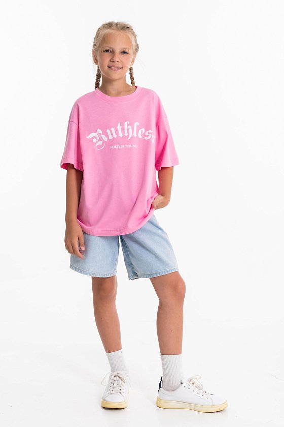 Детская футболка с принтом изготовлена из хлопкового полотна, что обеспечивает комфорт и хорошую воздухопроницаемость. Футболка имеет короткий рукав и круглый вырез горловины, что придает ей классический стильный вид. Такая модель футболки отлично сочетается с джинсами, брюками или юбкой. Изготовленная из натуральной ткани, футболка обеспечит комфорт в течение всего дня.