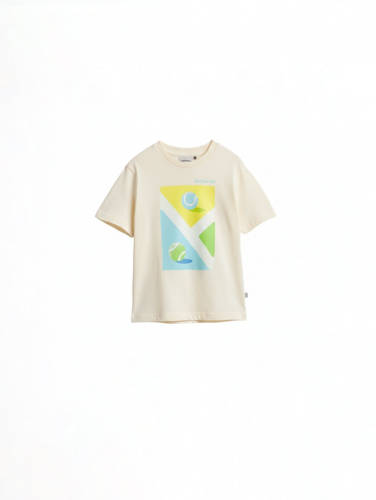 Футболка умеренного объема с округлым вырезом горловины из рибаны и объемный принтом на полочке.