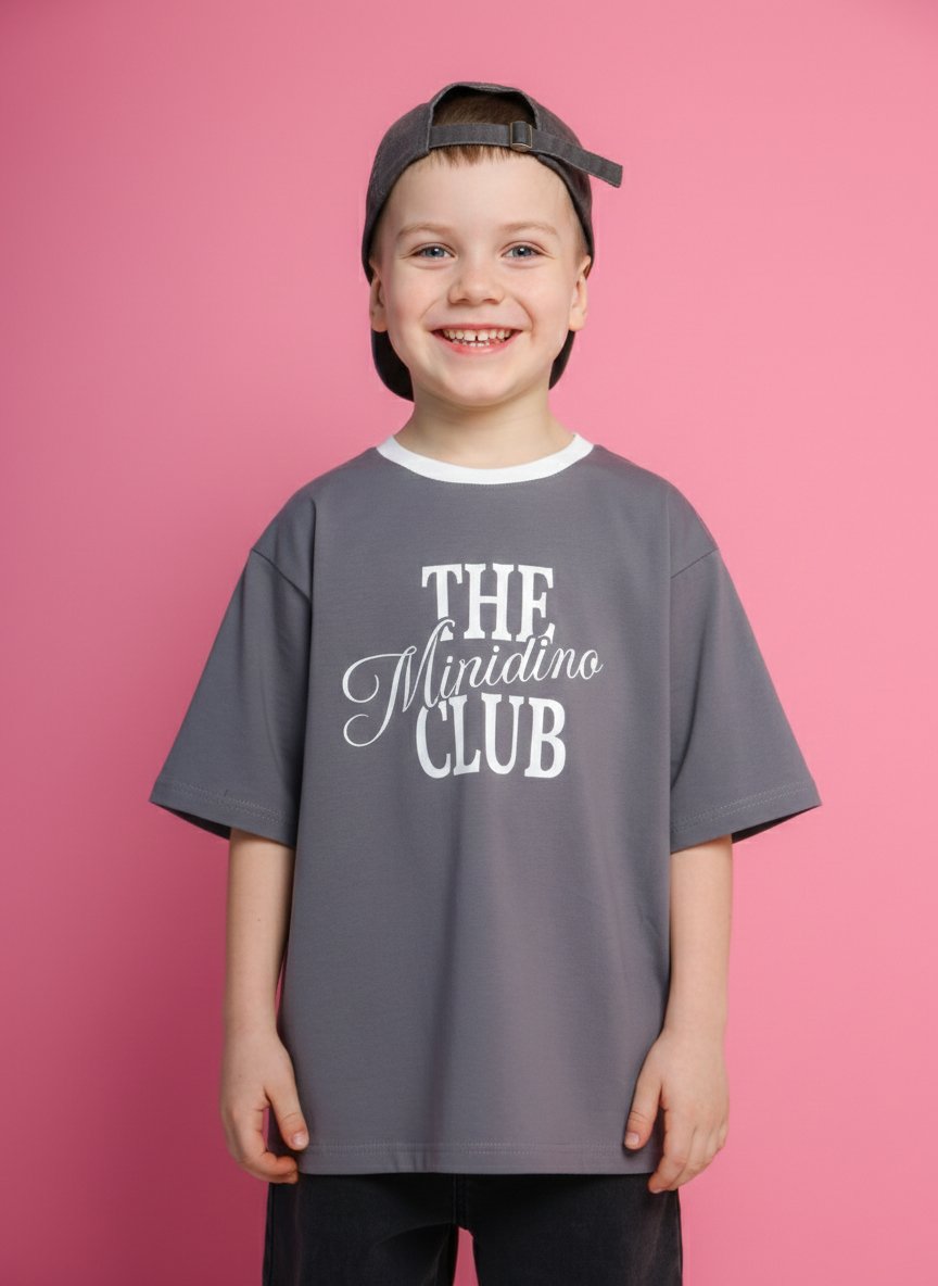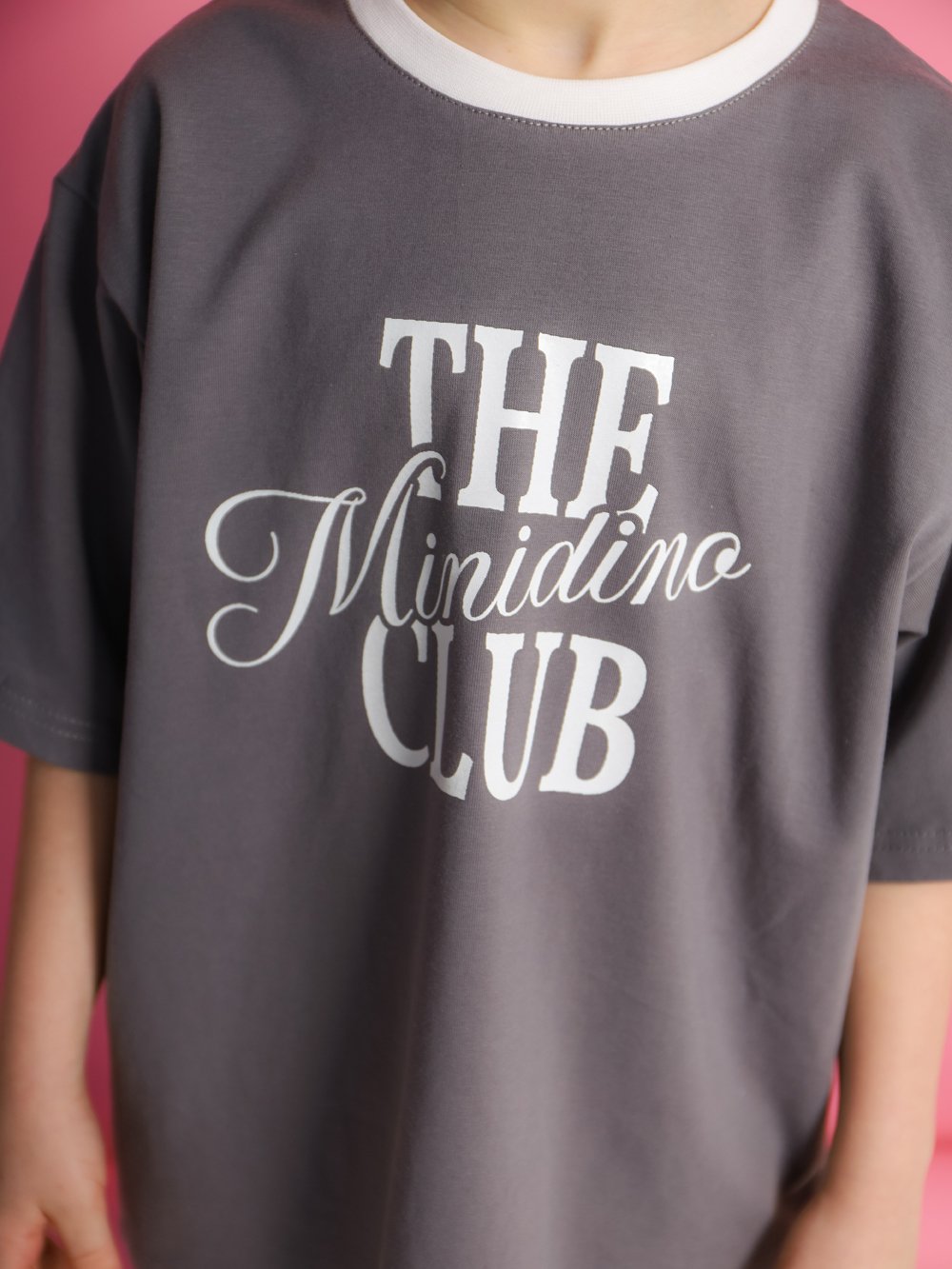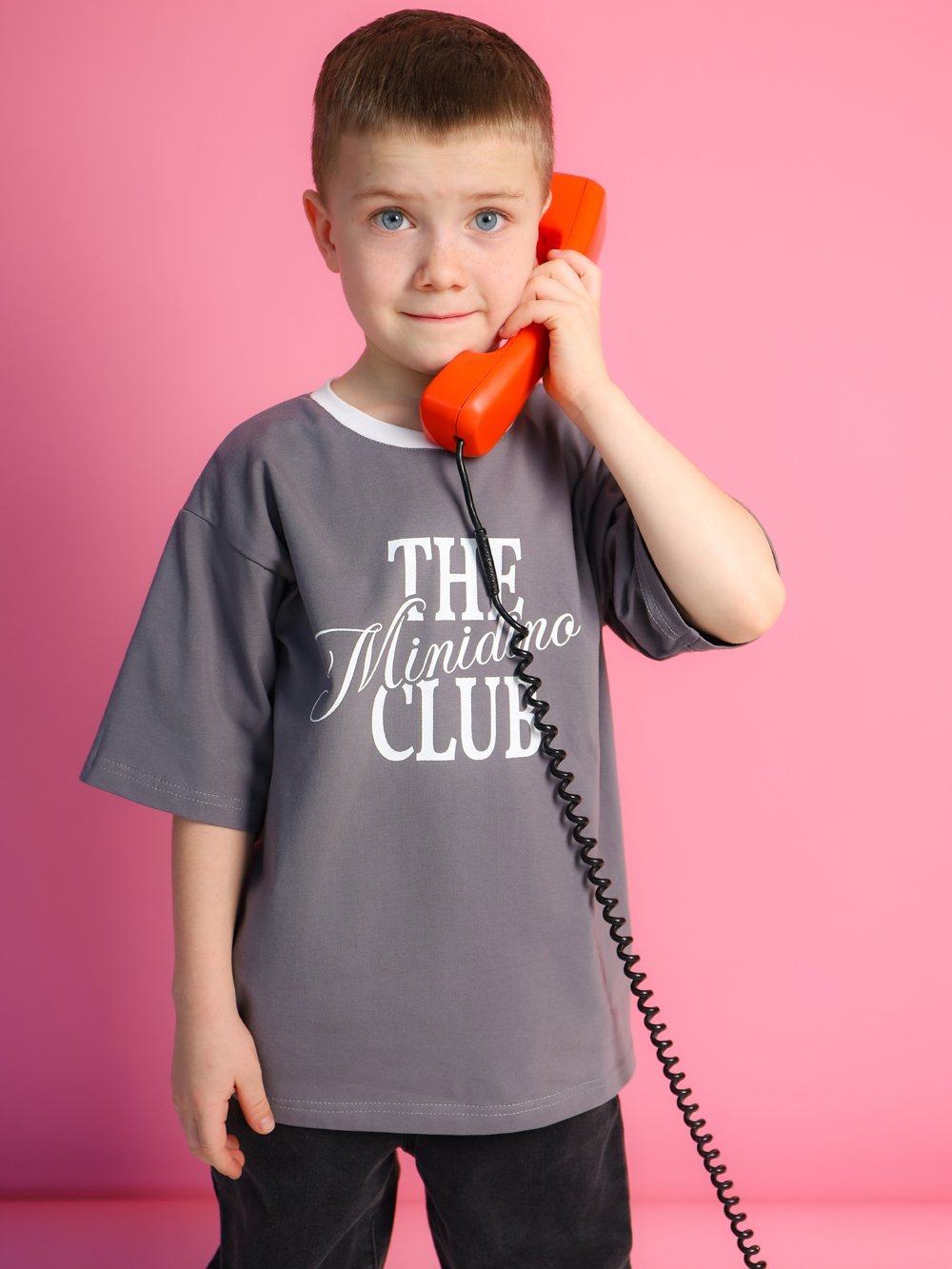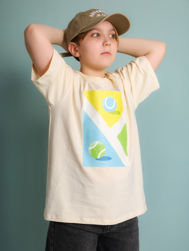 Футболка умеренного объема с округлым вырезом горловины из рибаны и объемный принтом на полочке.