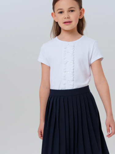 Прямой крой и лаконичный дизайн создают опрятный и современный силуэт. Планка с пуговицами дополнена аккуратной рюшей — стильный и в то же время сдержанный акцент для школьного образа. Шов по горловине украшен нежной тесьмой с люрексом — детали, которые нравятся девочкам и родителям.