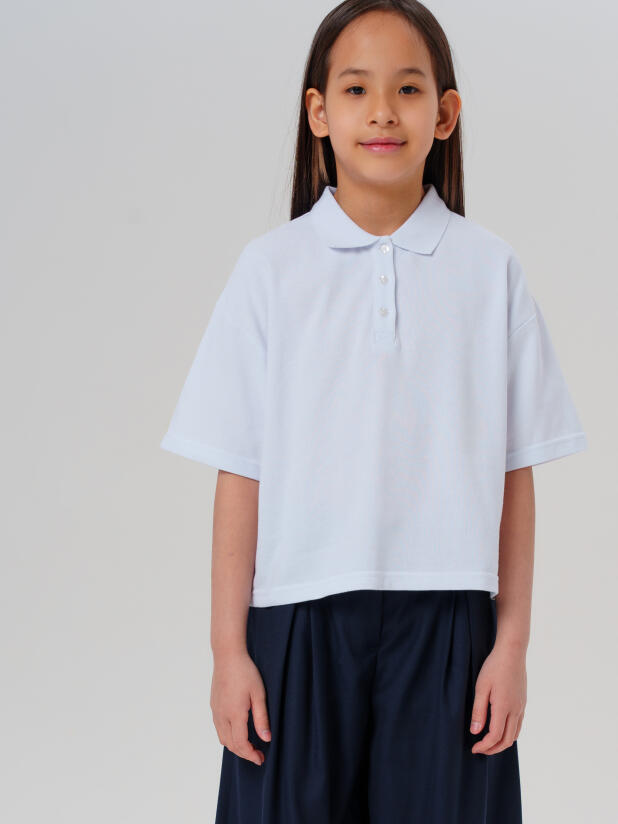 Базовое белое школьное поло оверсайз с коротким рукавом для девочки от PlayToday — комфорт, стиль и практичность каждый день. Идеально для школы и активных будней.