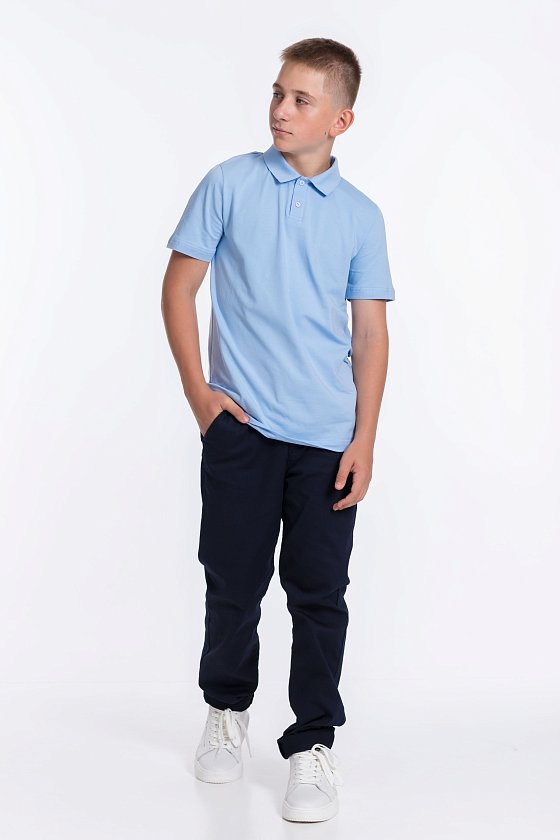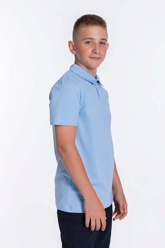 Голубая футболка-поло для мальчика с коротким рукавом из материала кулирка с лайкрой и застёжкой на две пуговицы — отличный выбор для школьника. Воротник придаёт изделию аккуратный вид, а качественный материал обеспечивает комфорт при носке.