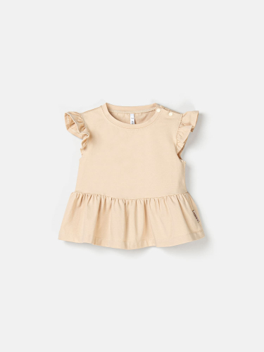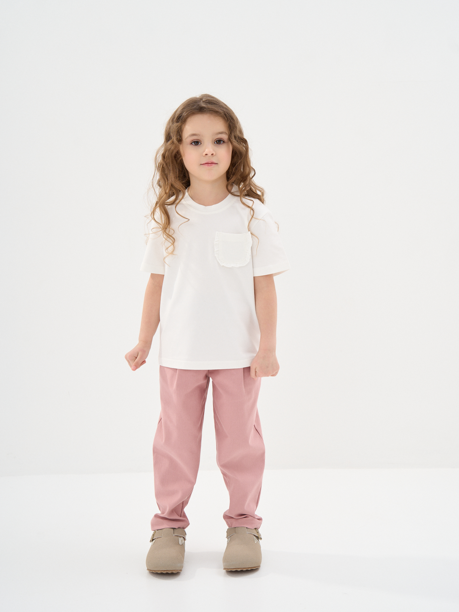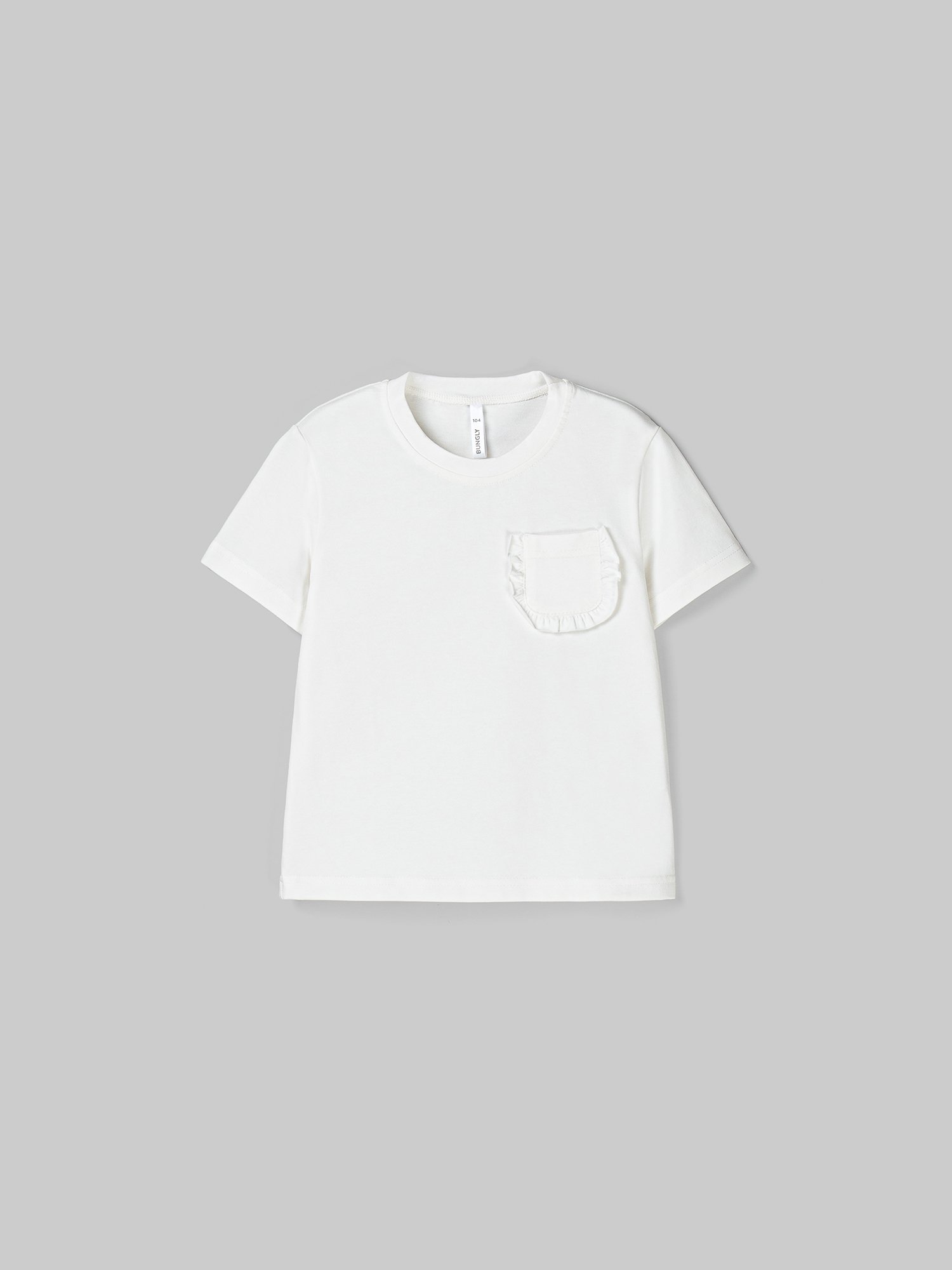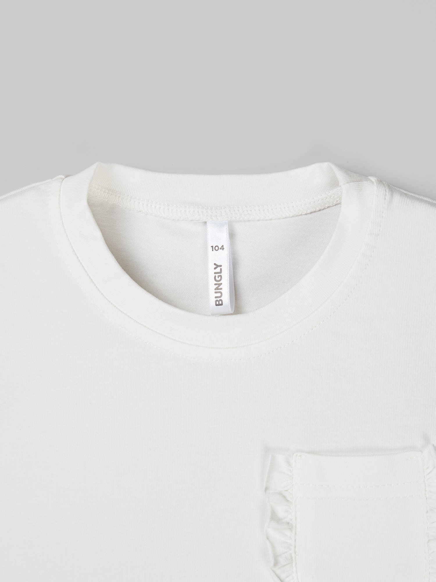 Футболка умеренного объема с карманом-рюшей на груди добавит в образ праздничности.