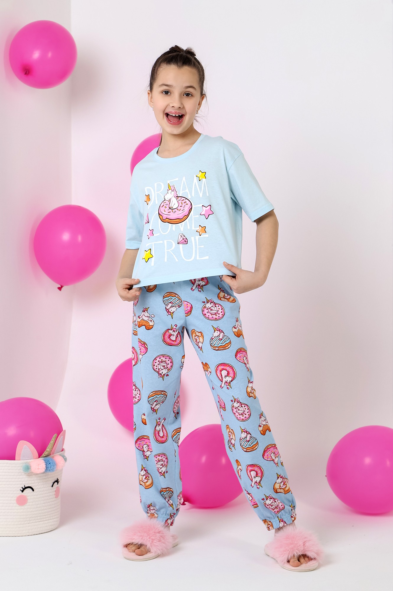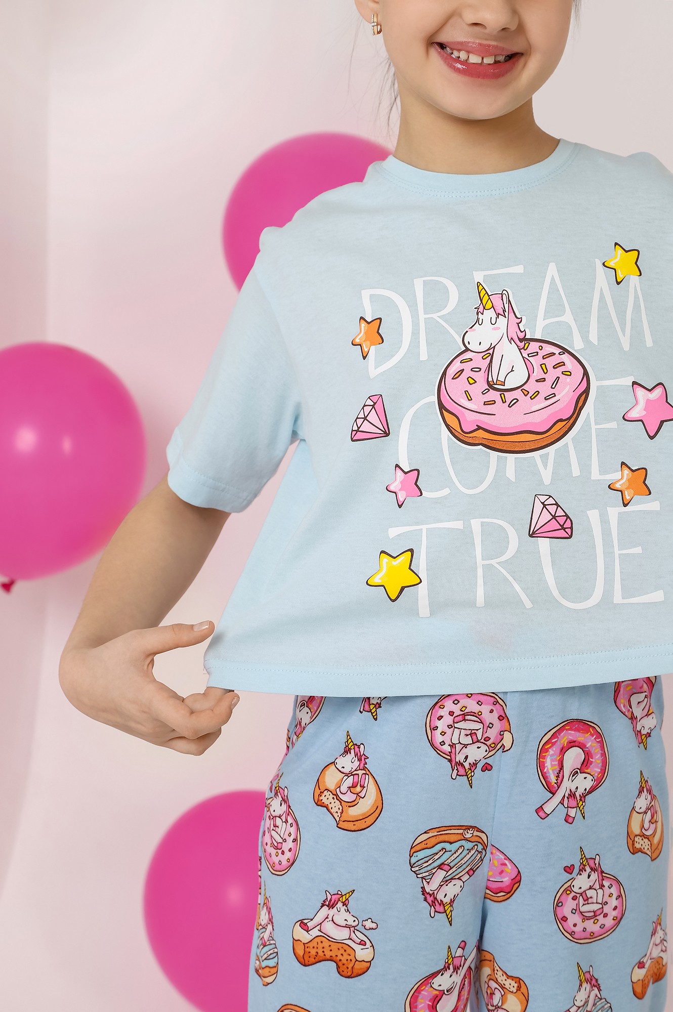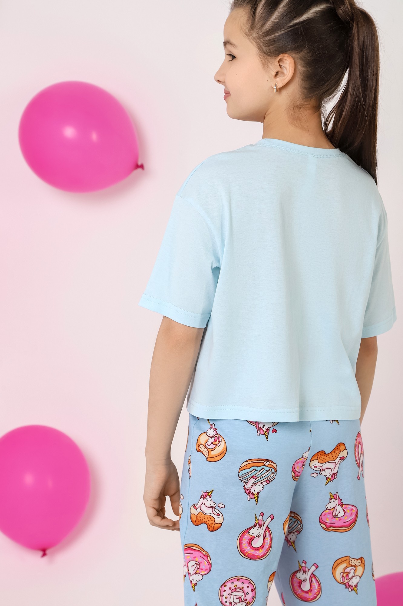 Пижама для девочки из трикотажного полотна "кулирка", состоящая из футболки и брюк. Футболка - из гладкокрашеного полотна, слега расширенная и укороченная, с втачными короткими рукавами, горловиной овальной формы, обработанной втачной планкой и принтом в центре переда, выполненным в технике шелкографии. Брюки из полотна с набивным тематическим рисунком, длинные, с эластичной тесьмой по талии и нижним срезами.