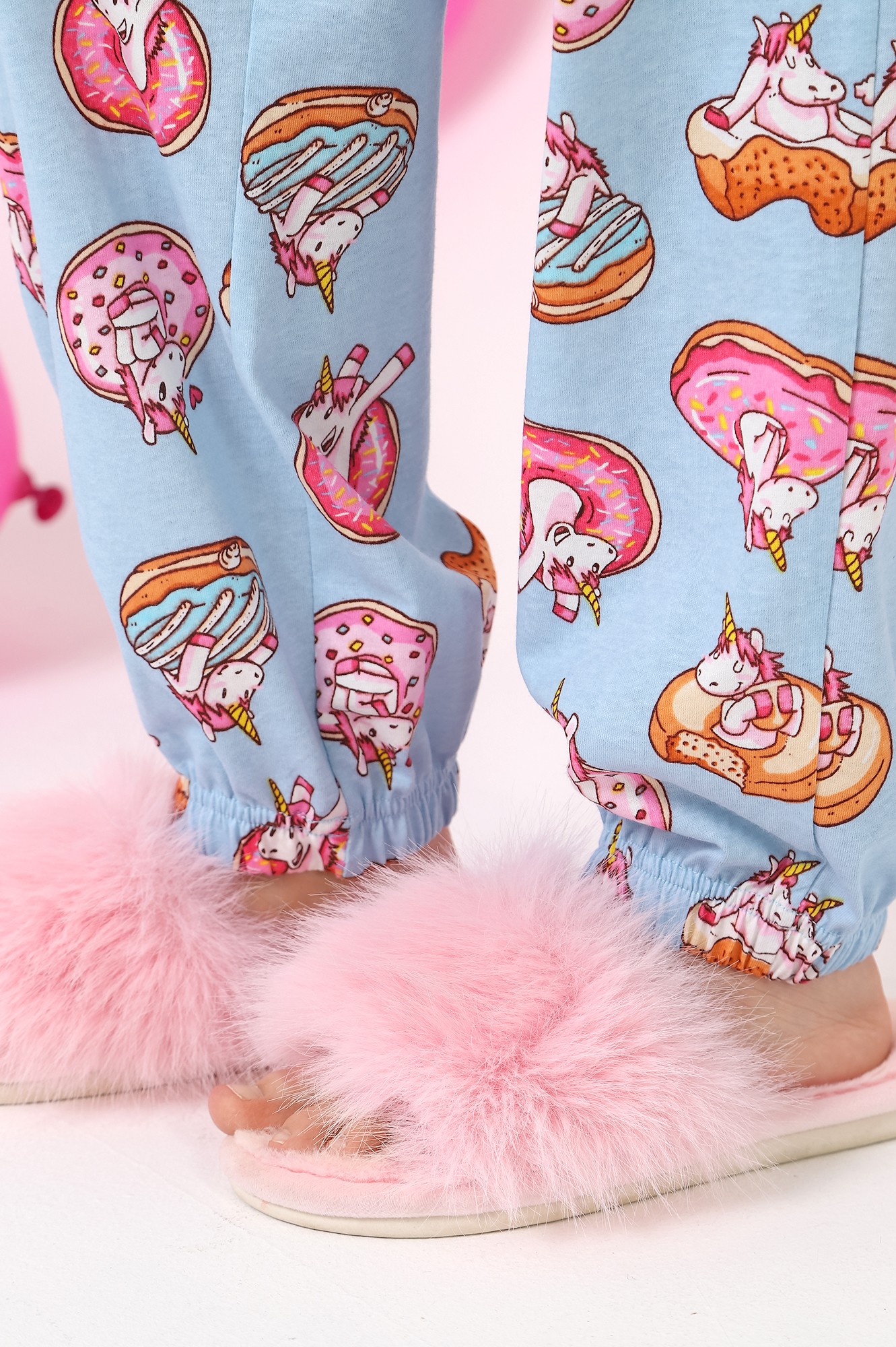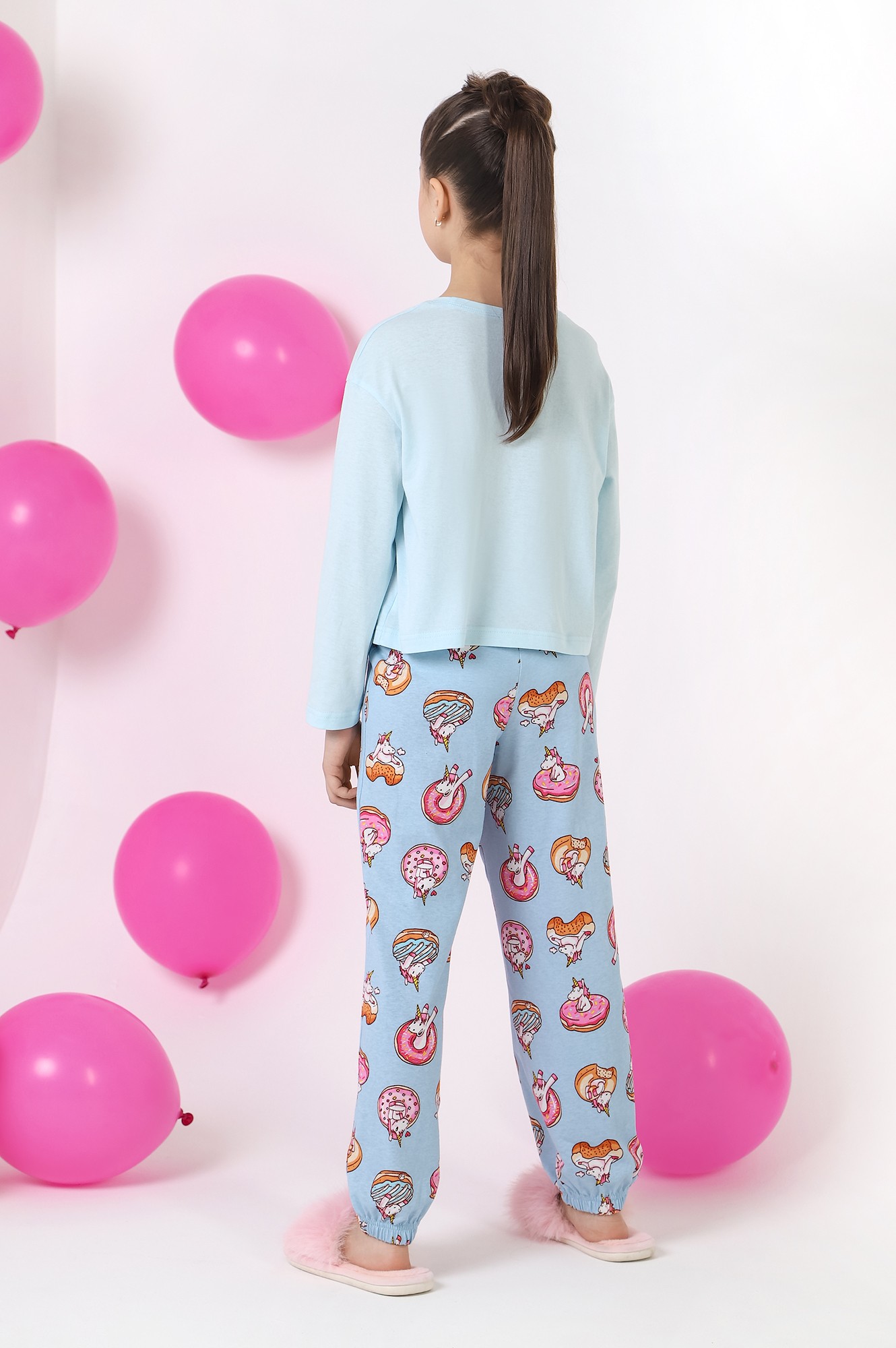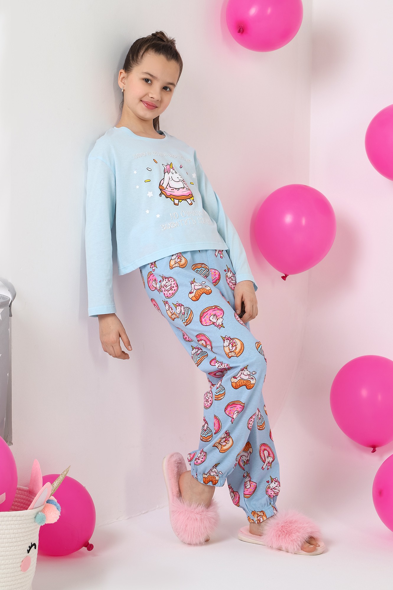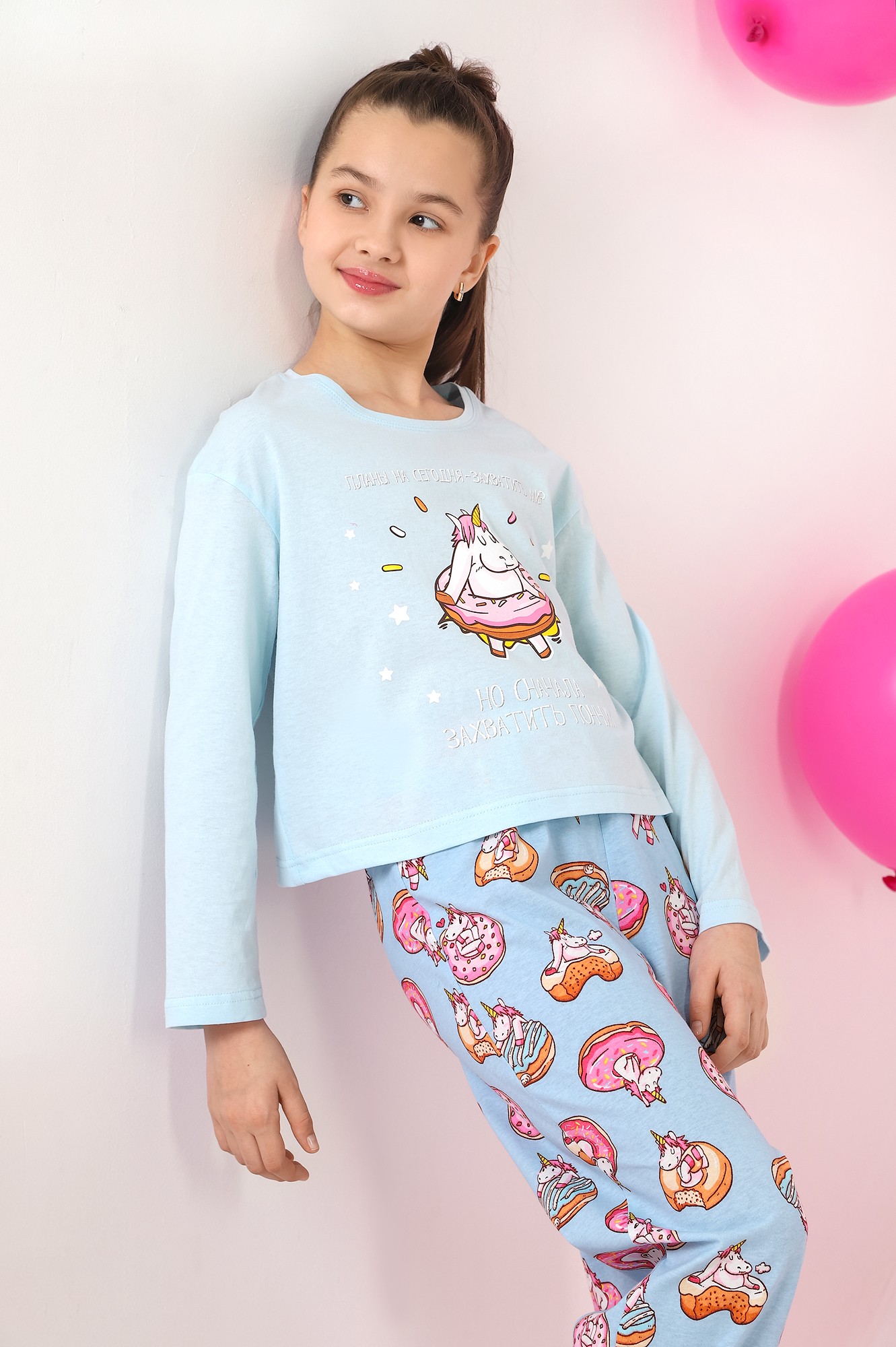 Пижама для девочки из трикотажного полотна "кулирка", состоящая из джемпера и брюк. Джемпер - из гладкокрашеного полотна, слега расширенный и укороченный, с втачными длинными рукавами, горловиной овальной формы, обработанной втачной планкой и принтом в центре переда, выполненным в технике шелкографии. Брюки из полотна с набивным тематическим рисунком, длинные, с эластичной тесьмой по талии и нижним срезами.