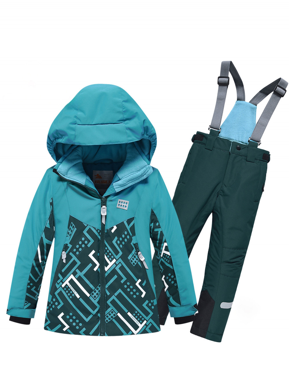 Детский зимний костюм включает в себя куртку прямого кроя с комбинированным дизайном и однотонные горнолыжные брюки.