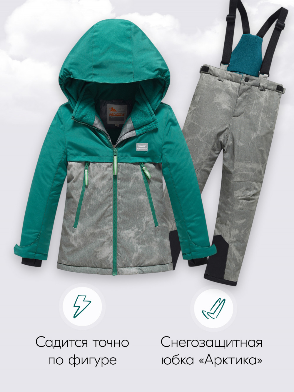 Снегозащитная юбка и снегозащитные гамаши не позволяют снегу попадать под куртку и в брюки, а комбинированный дизайн с эффектом варенки добавляет стильности и оригинальности.