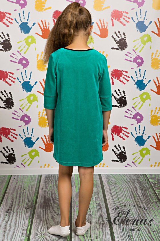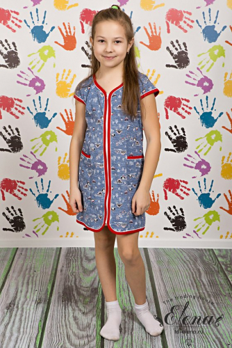 Халат для девочки выполнен из велюра. Центральная застёжка на молнию, рукава длиной 3/4. Спереди расположены два накладных кармана. На рукавах и карманах в качестве отделки настрочена репсовая лента.