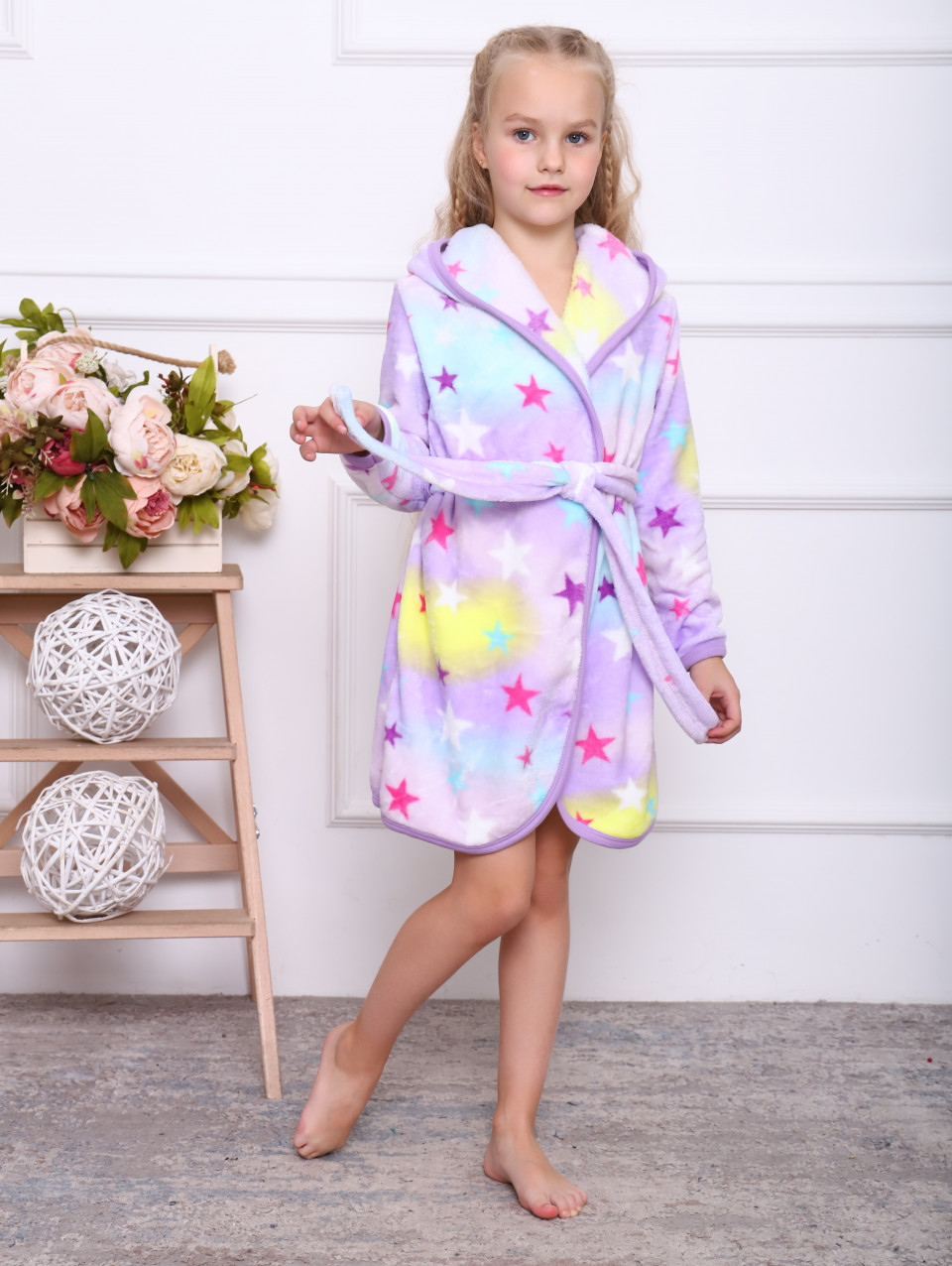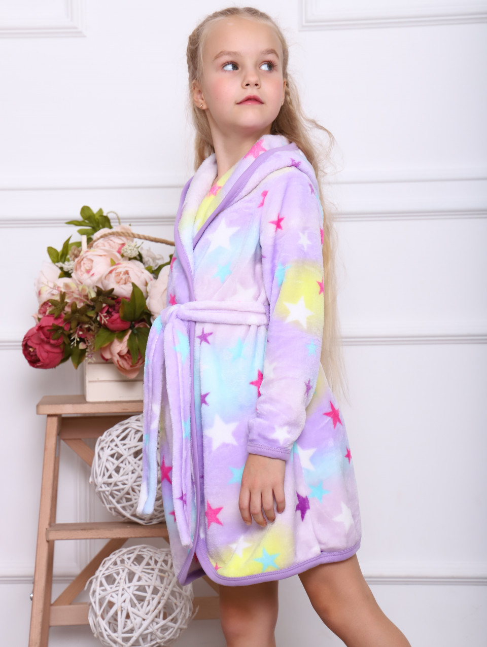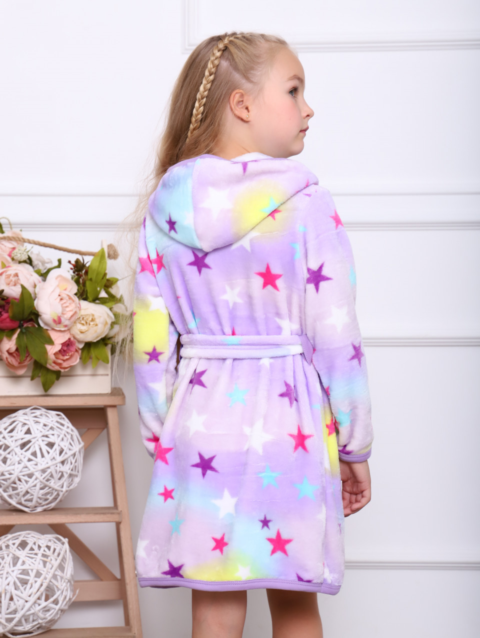Халат на запах с капюшоном и поясом.