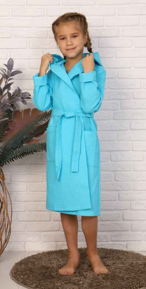 Халат вафельный детский с капюшоном ВД-БИР-2069, бирюзовый