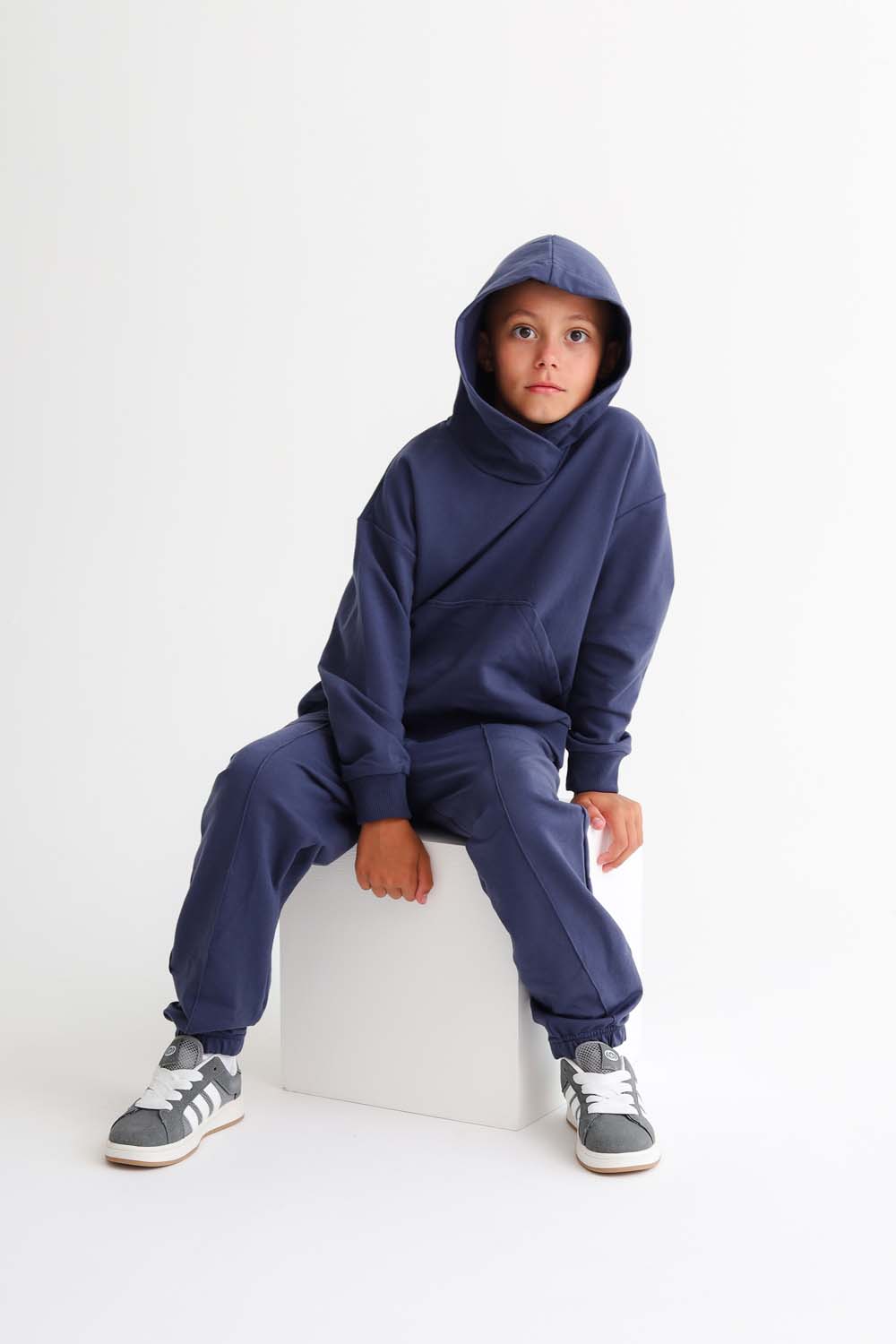 Худи свободного силуэта с карманом кенгуру по центру полочки, с одношовным капюшоном на подкладке из кулирки. Спущенная линия плеча. Манжеты на рукавах и по низу изделия - из кашкорсе.