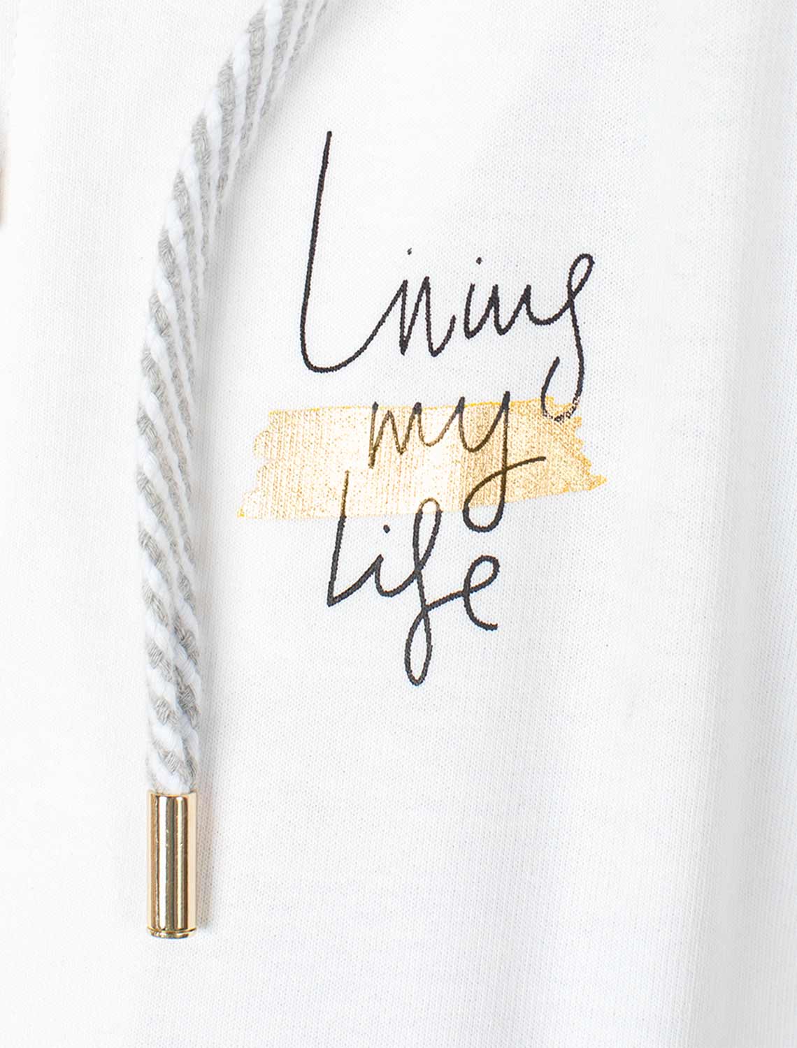 Белое худи на молнии с длинными рукавами и спущенной линией плеч сшито из премиального хлопкового футера. Материал отлично поддерживает циркуляцию воздуха, а крой не ограничивает движения. Модель с высококачественной золотистой фурнитурой украшена устойчивым принтом. Идеально в костюме с брюками F44.060