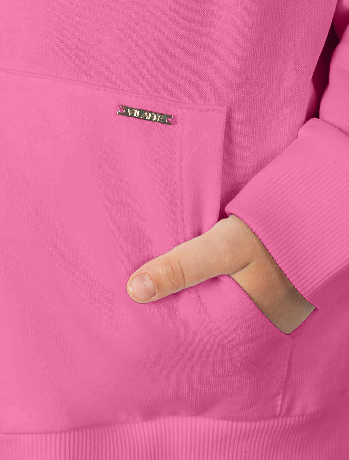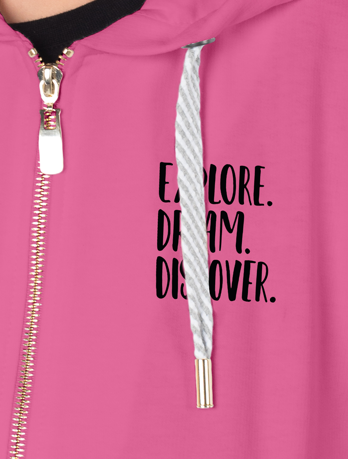Худи цвета фуксия на молнии с длинными рукавами и спущенной линией плеч сшито из премиального хлопкового футера. Материал отлично поддерживает циркуляцию воздуха, а крой не ограничивает движения. Модель с высококачественной золотистой фурнитурой украшена устойчивым принтом. Идеально в костюме с брюками F44.060