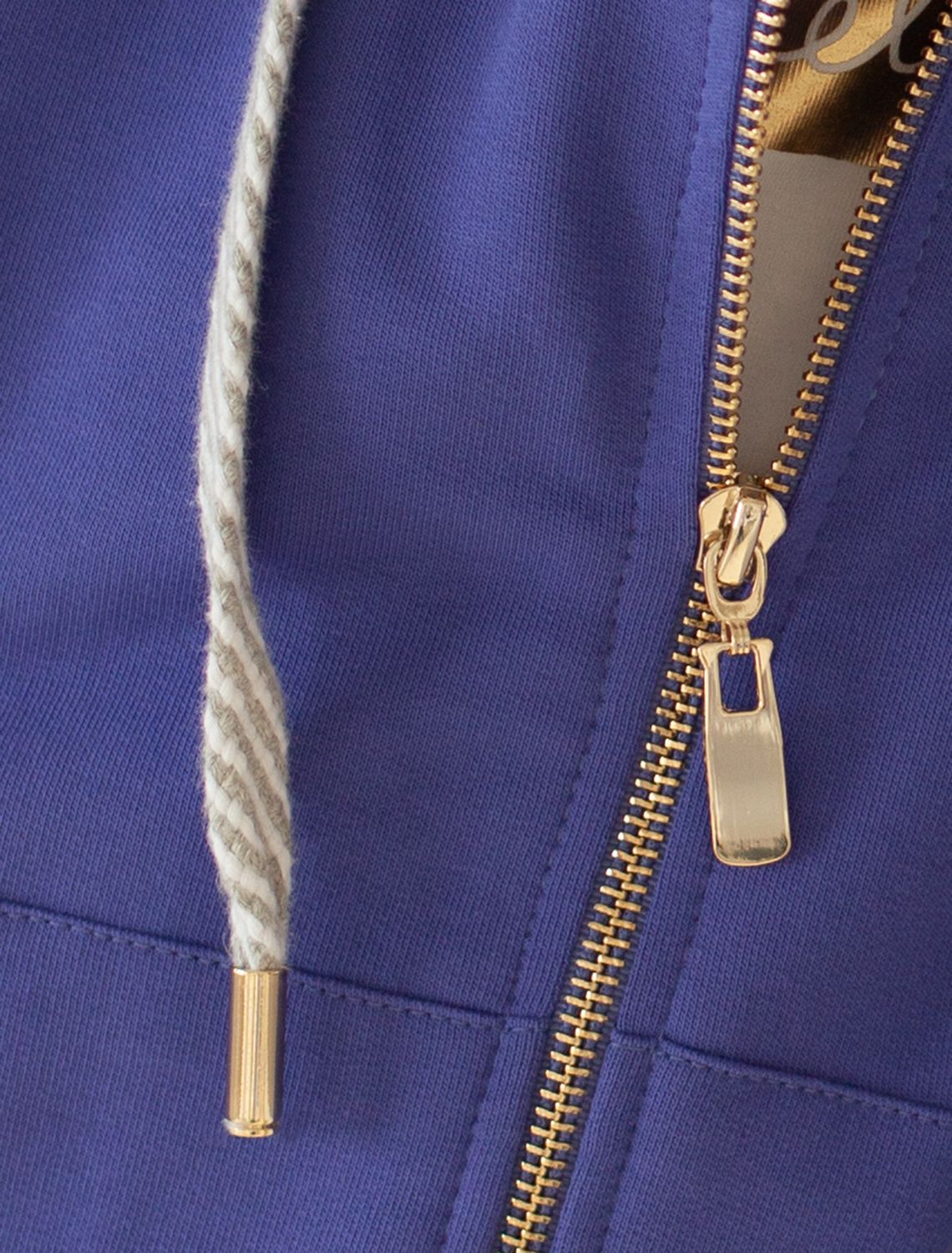 Лавандовое худи на молнии с длинными рукавами и спущенной линией плеч сшито из премиального хлопкового футера. Материал отлично поддерживает циркуляцию воздуха, а крой не ограничивает движения. Модель с высококачественной золотистой фурнитурой украшена устойчивым принтом. Идеально в костюме с брюками F44.060