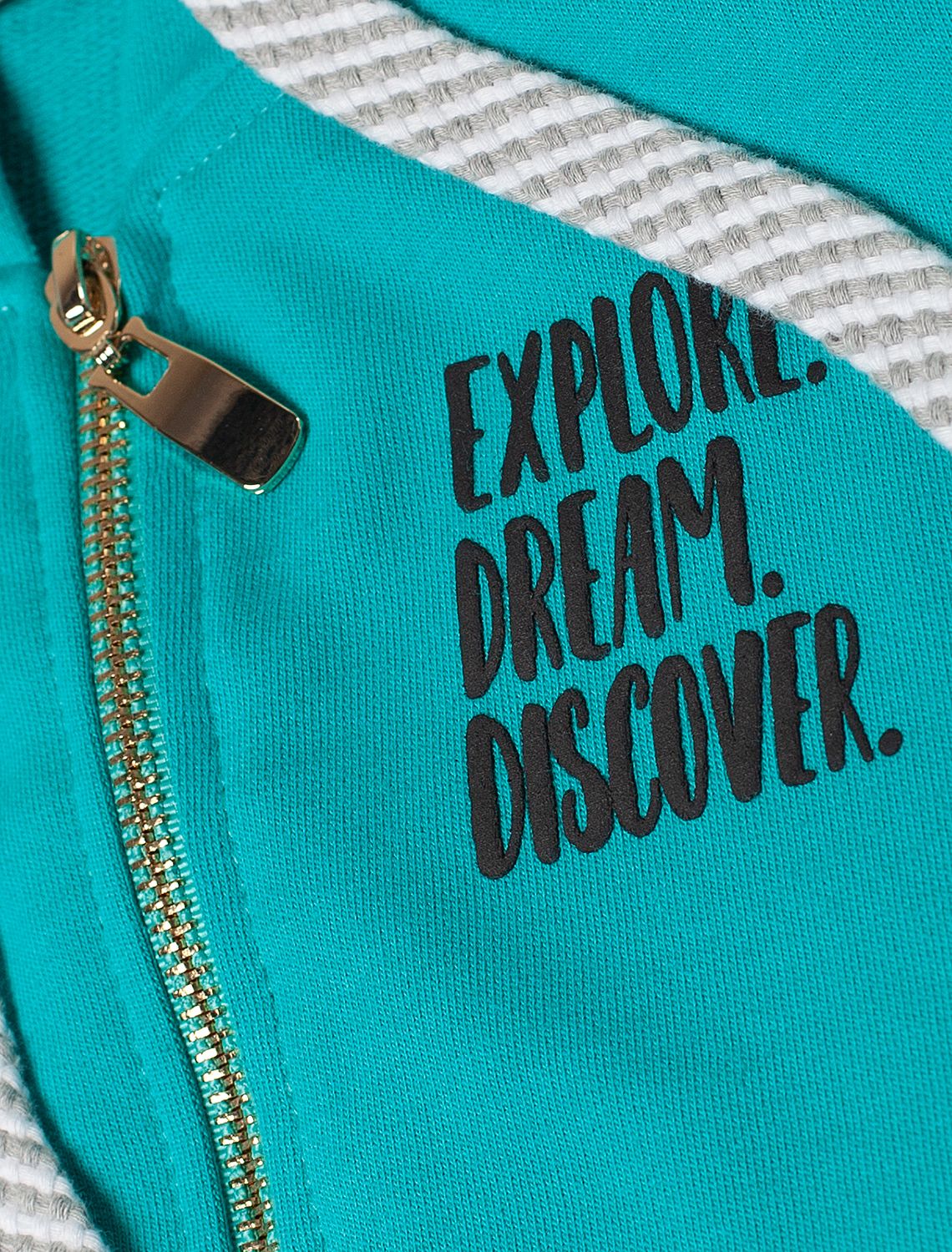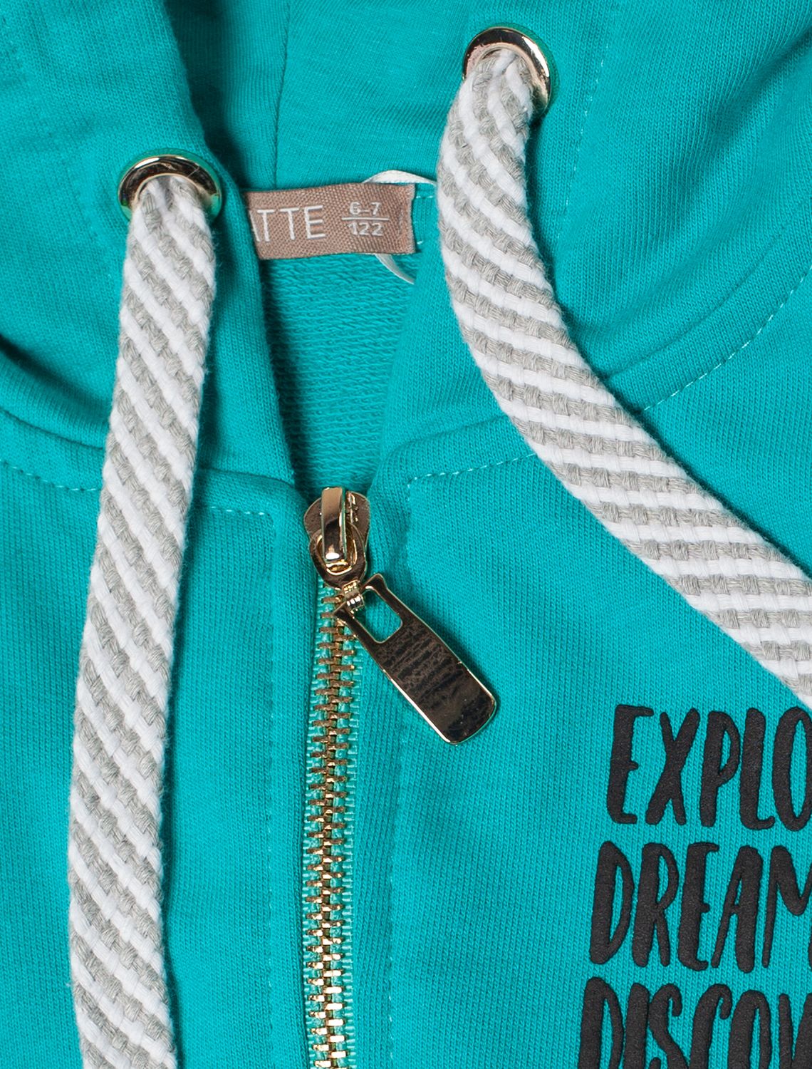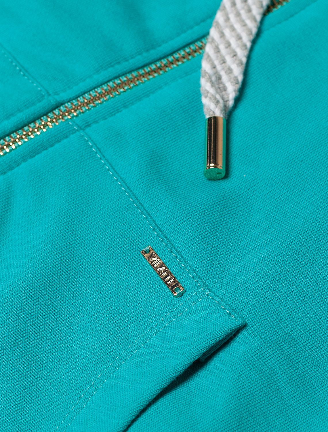 Мятное худи на молнии с длинными рукавами и спущенной линией плеч сшито из премиального хлопкового футера. Материал отлично поддерживает циркуляцию воздуха, а крой не ограничивает движения. Модель с высококачественной золотистой фурнитурой украшена устойчивым принтом. Идеально в костюме с брюками F44.060