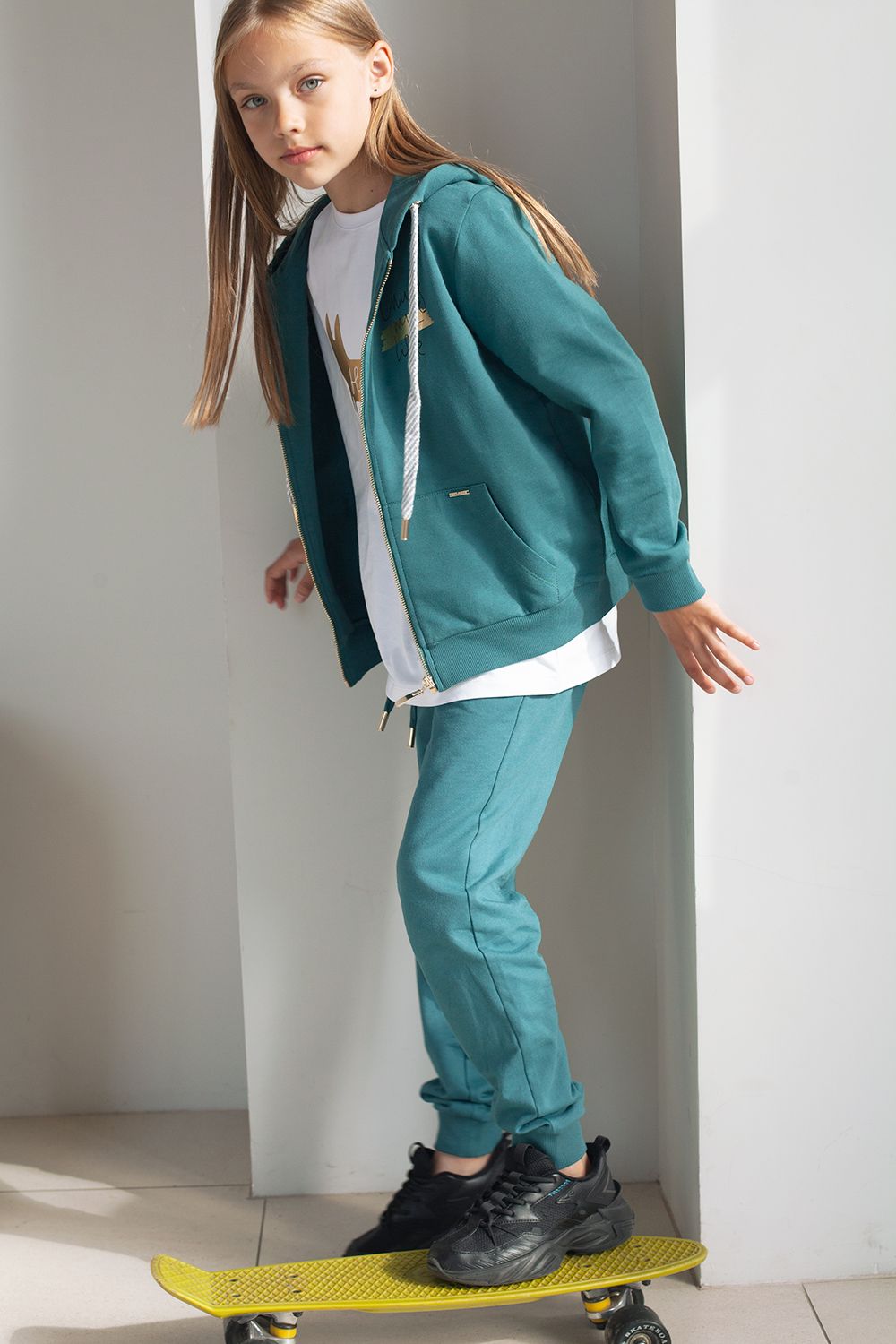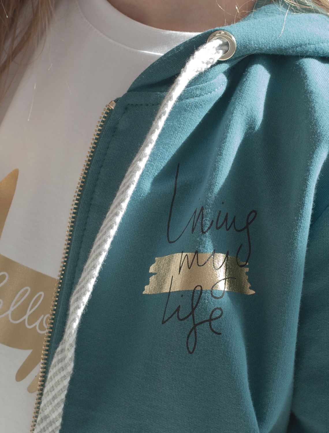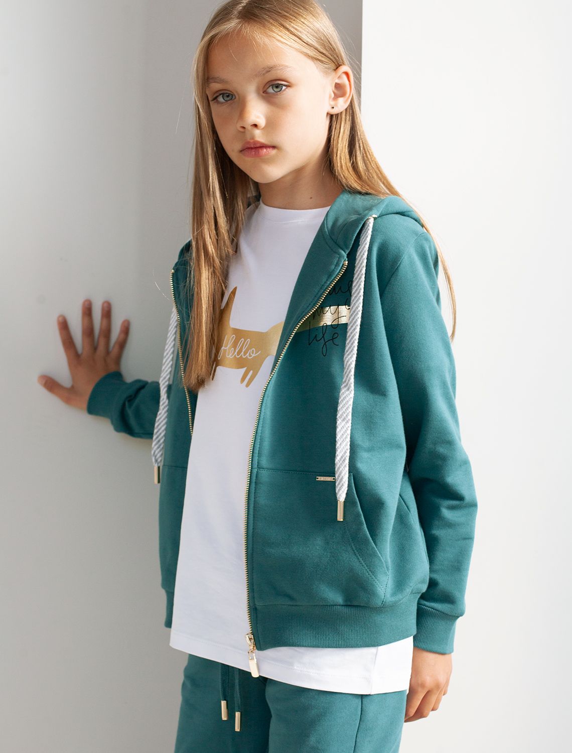 Худи модного оттенка полынь на молнии с длинными рукавами и спущенной линией плеч сшито из премиального хлопкового футера. Материал отлично поддерживает циркуляцию воздуха, а крой не ограничивает движения. Модель с высококачественной золотистой фурнитурой украшена устойчивым принтом. Идеально в костюме с брюками F44.060