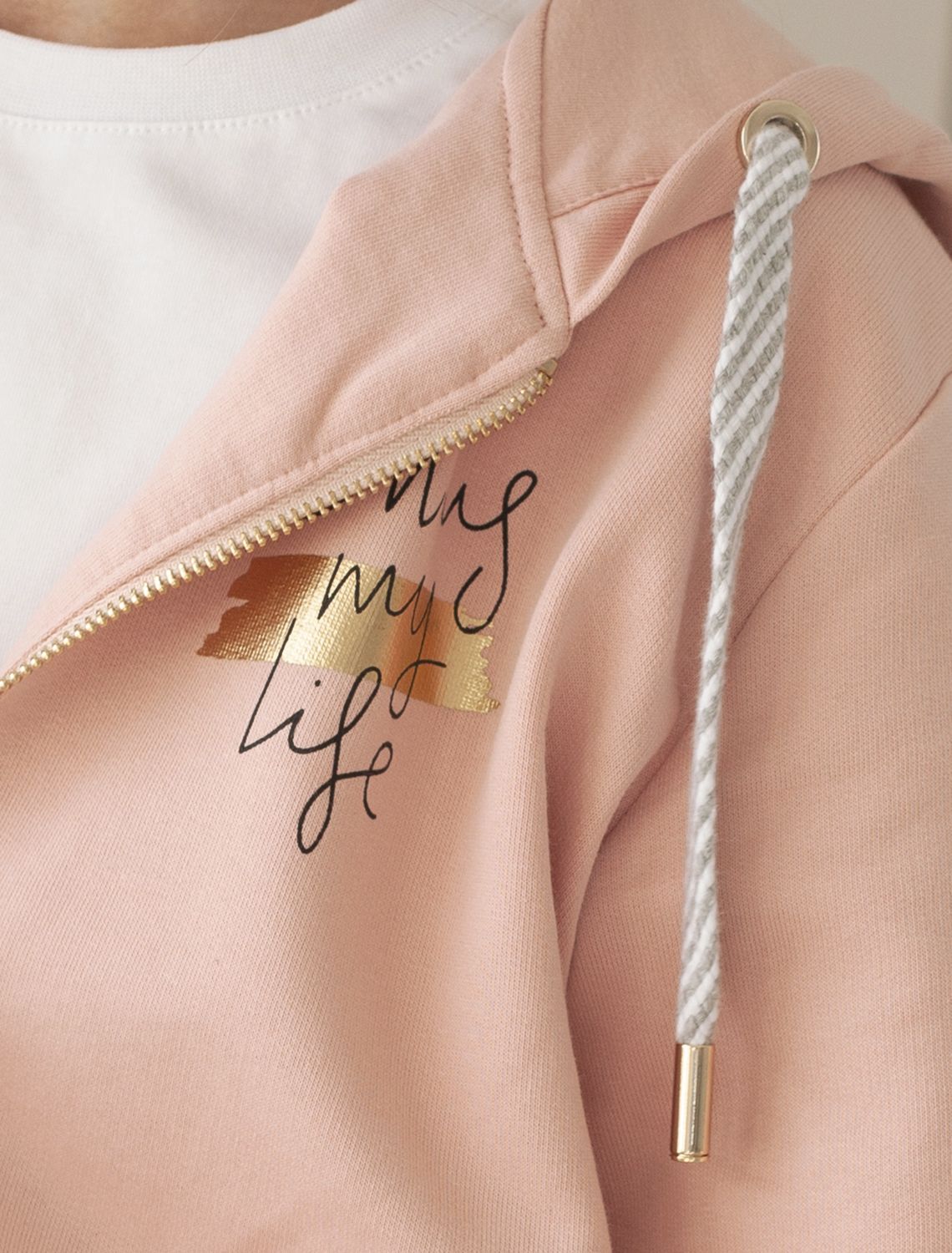 Пудровое худи на молнии с длинными рукавами и спущенной линией плеч сшито из премиального хлопкового футера. Материал отлично поддерживает циркуляцию воздуха, а крой не ограничивает движения. Модель с высококачественной золотистой фурнитурой украшена устойчивым принтом. Идеально в костюме с брюками F44.060