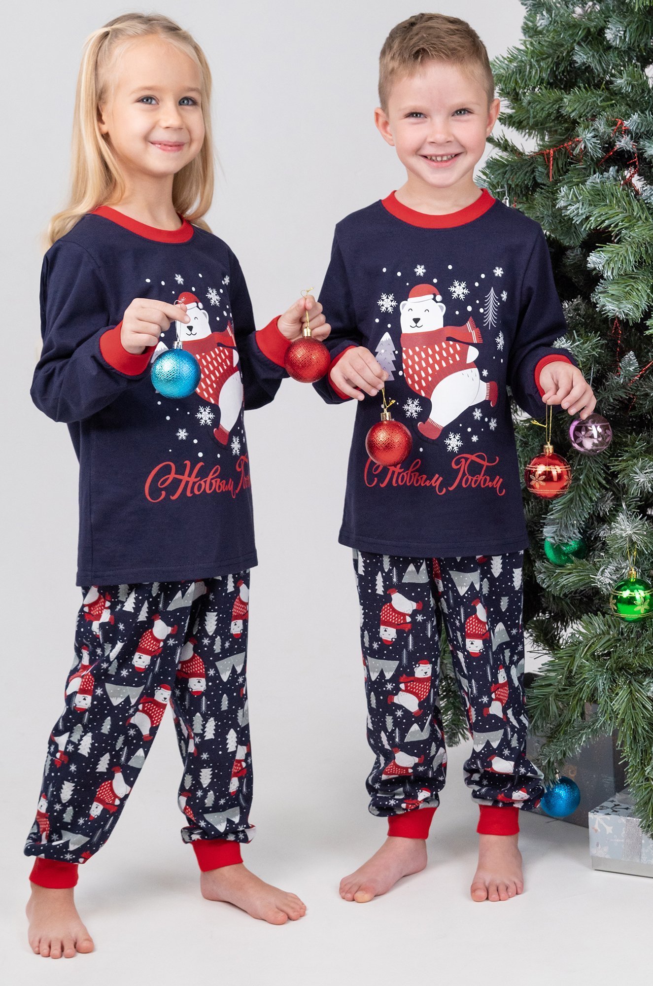 Детская пижама с брюками выполнена из натурального 100% хлопка. Свободный крой не сковывает движений и позволяет ребенку всегда оставаться активным, а яркий синий цвет и праздничный принт Мишка создают уютную атмосферу и поднимают настроение. Трикотажная пижамка для мальчикови девочек станет отличным подарком на Новый год и Рождество.