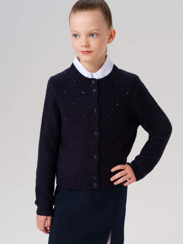 Этот синий подростковый кардиган для школы мягко садится по фигуре, не стесняет движений и подчеркивает индивидуальный стиль подростка. Декор из страз добавляет яркий акцент и делает образ более нарядным — такой стильный синий кардиган точно понравится девочкам, которые любят быть в центре внимания.