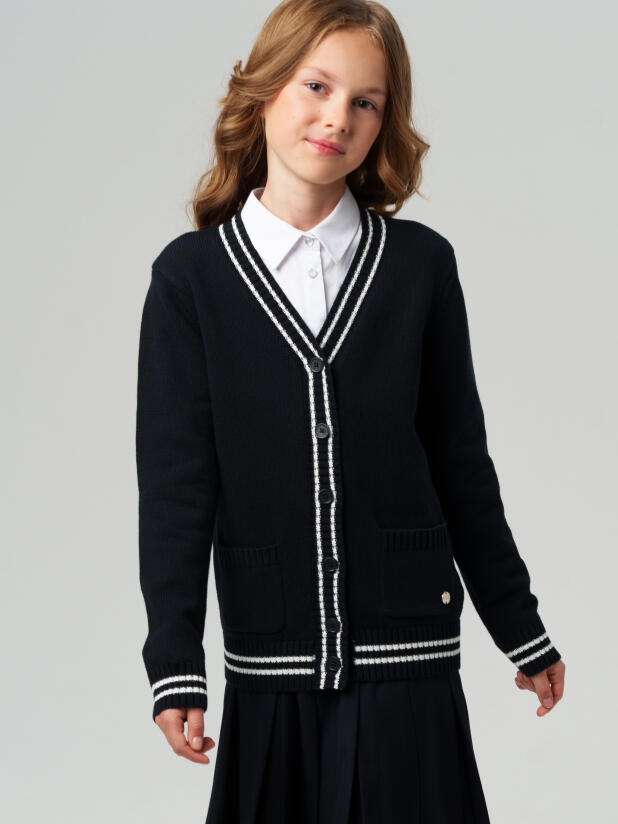 Совет по стилю: комбинируйте нарядный детский трикотажный кардиган с классической белой рубашкой и тёмной юбкой для строгого школьного образа или добавьте яркую футболку для повседневного комплекта.