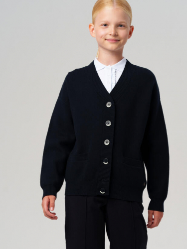 Классический темно-синий школьный вязаный кардиган для девочки подростка от PlayToday — стильная и универсальная кофта для школы, которая легко станет любимой частью гардероба. Прямой силуэт и застёжка на пуговицы придают кардигану элегантный вид, а лаконичный дизайн позволяет сочетать его с любыми школьными вещами.