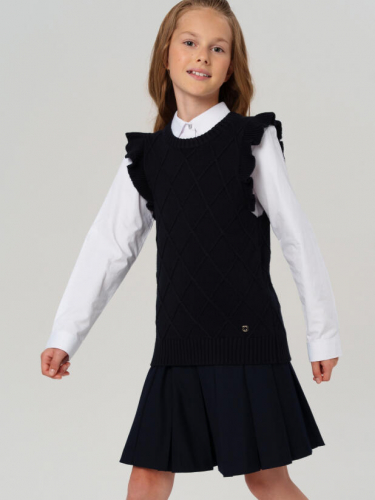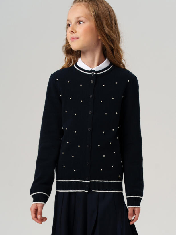 Классический темно-синий школьный вязаный кардиган на пуговицах для девочки подростка от PlayToday — элегантное решение для повседневных школьных образов. Украшенный жемчужным декором, он сочетает в себе строгость формы и утончённый стиль, оставаясь в рамках школьного дресс-кода.