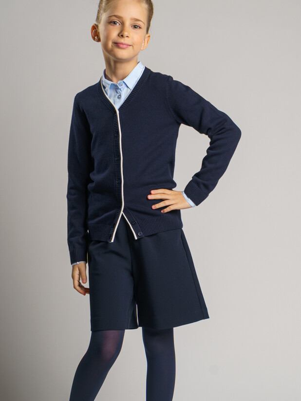 Классический синий школьный кардиган для девочки подростка. Кардиган прямого силуэта на пуговицах выполнен из вязаного трикотажа с высоким содержанием хлопка. Кофта в школу выглядит стильно, благодаря лаконичному дизайну. С любой рубашкой, футболкой или поло, кардиган для школьницы составит красивый элегантный комплект для школы.