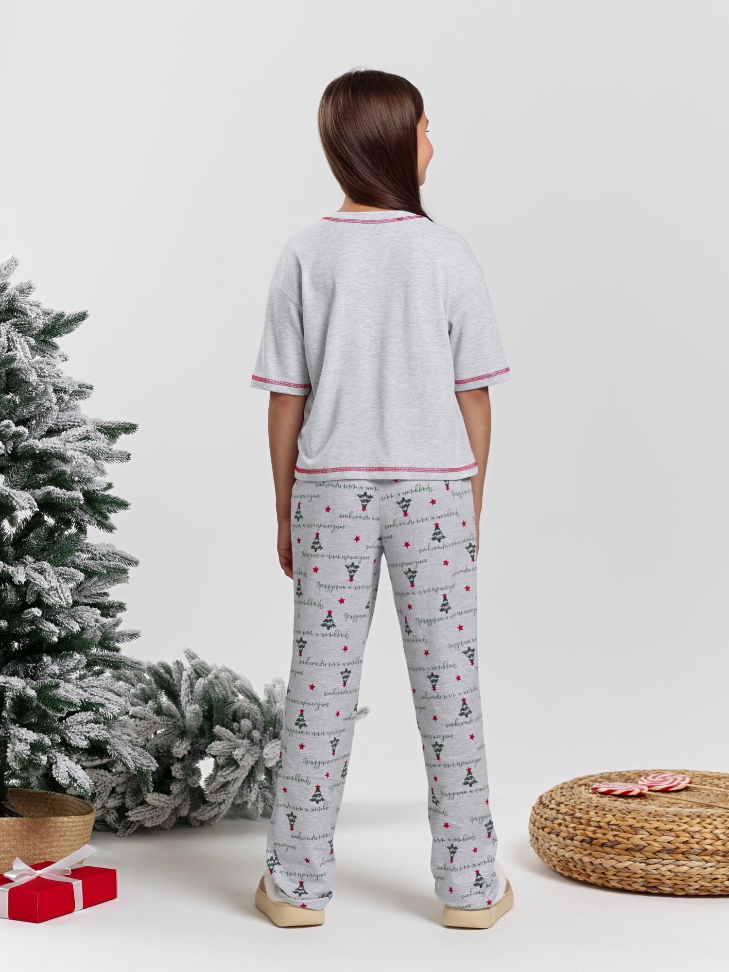 Костюм для девочки из трикотажного полотна в комбинации двух видов: полотна "кулирка-кармеланж" и полотна "кулирка"с набивным тематическим рисунком , состоящий из футболки и брюк. Футболка - модного силуэта, слегка укороченная свободного покроя, с приспущенным плечом, с втачными рукавами длиной до локтя, горловиной овальной формы, обработанной втачной планкой и принтом в центре переда. По шву втачивани я планки настрочена декоративная (5-ниточная) отделочная строчка нитками контрастного цвета Подгибка низа рукавов и изделия так же выполнена с применением декоративной отделочной строчки. Брюки выполнены из полотна с набивным тематическим рисунком, длинные, умеренной ширины, прямые, с эластичной тесьмой по талии.