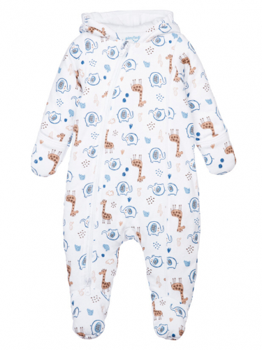 Комбинезон из натурального хлопка с утеплителем. Капюшон с легкой фиксацией на резинку. Удобная застежка на молнию. На рукавах митенки.