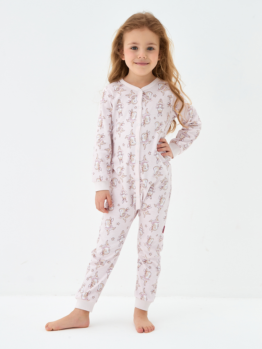 Комбинезон для девочки с длинным рукавом из высококачественного хлопкового полотна (интерлок). Приятный на ощупь трикотаж с интересным набивным рисунком "зайка". Удобная застежка на кнопки, эластичные манжеты на рукавах и ножках  обеспечат максимальный комфорт и уют вашему ребёнку. Для размеров 80,86 застежка предусмотрена по длине ножки для смены подгузника. Размеры 92-116 - застежка до бедер. Комбинезон идеален для отдыха и сна.