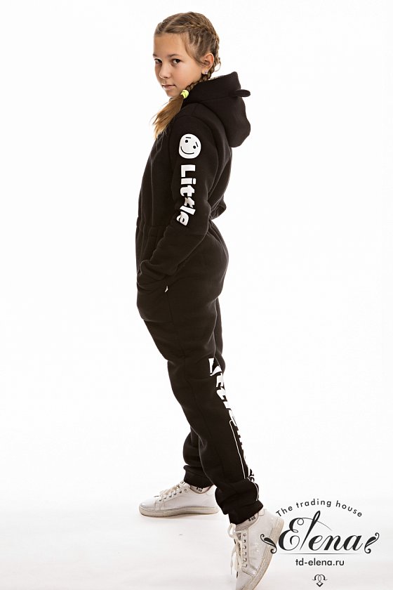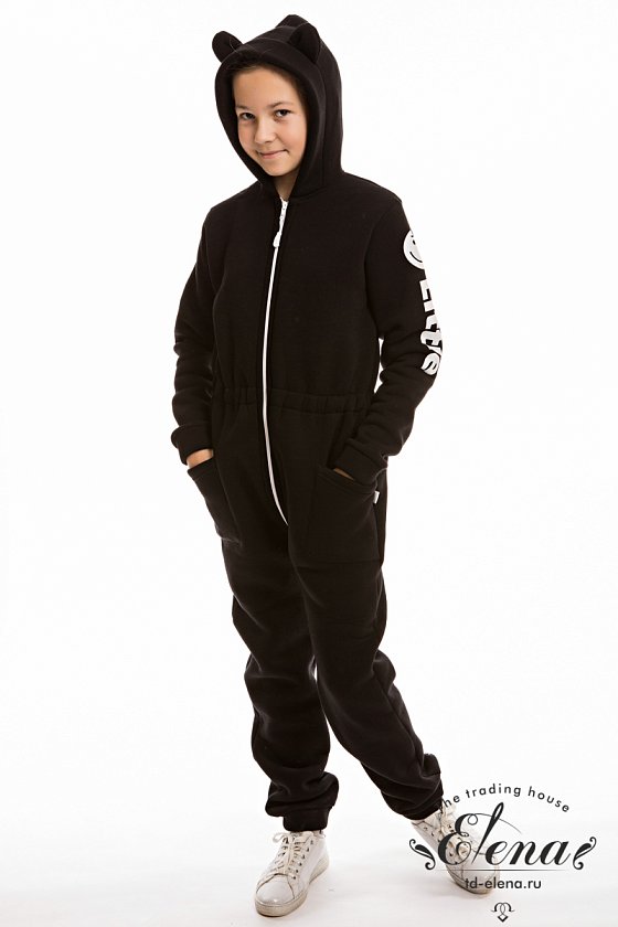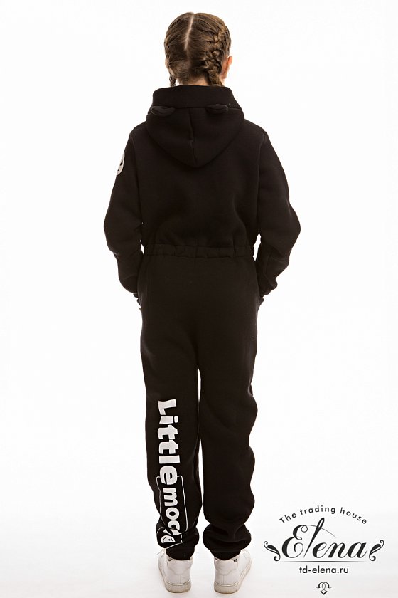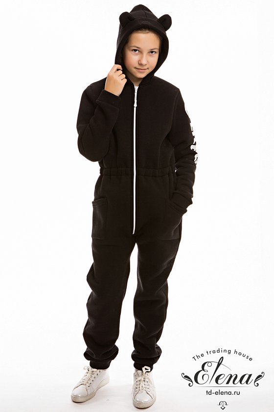 Комбинезон из однотонного футера с начёсом. С капюшоном с "ушками", застёжкой на молнию и накладными карманами спереди. По талии кулиска с резинкой. Рукава и низ брюк с притачными манжетами. Сбоку на рукаве и сзади костюм украшен принтом.