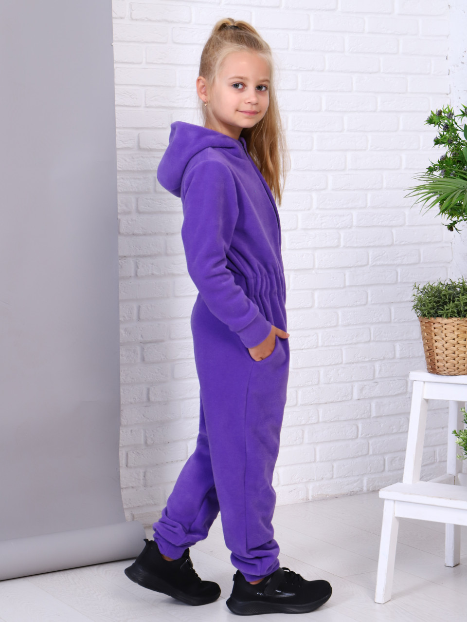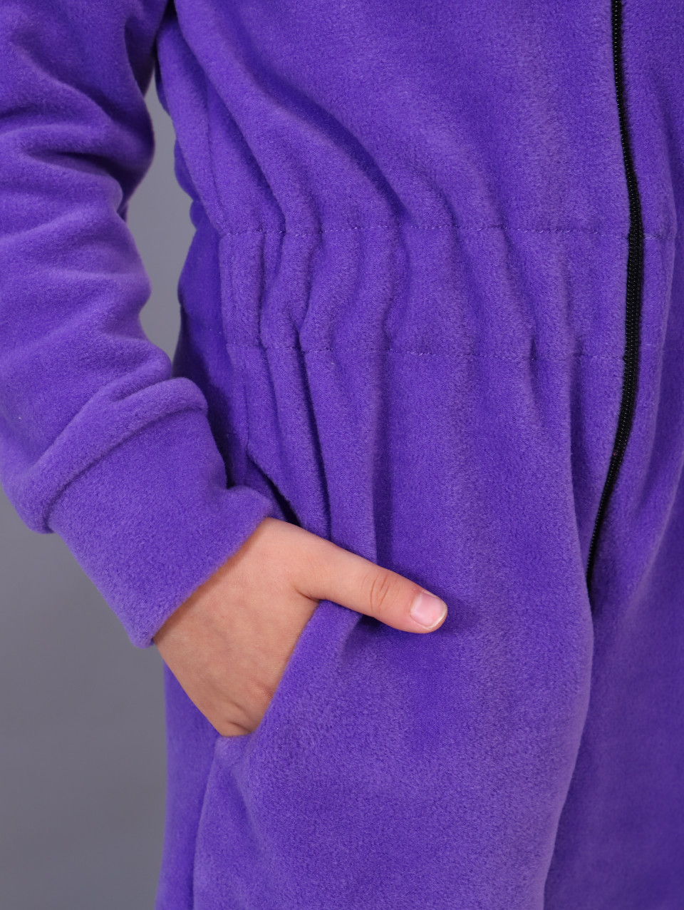 Детский комбинезон из мягкой флисовой ткани. Предназначен для повседневной носки в осенне-зимний период в качестве первого слоя или самостоятельной одежды. Флисовый комбинезон утепленный пригодится для долгих прогулок в путешествии или в парке рядом с домом. Флисовая поддева универсальна, подойдет для мальчика и для девочки, можно использовать как термобелье. Комбинезон застегивается на молнию, есть капюшон. Сзади на поясе вшита резинка-утяжка, рукава и низ штанин оформлены манжетами.